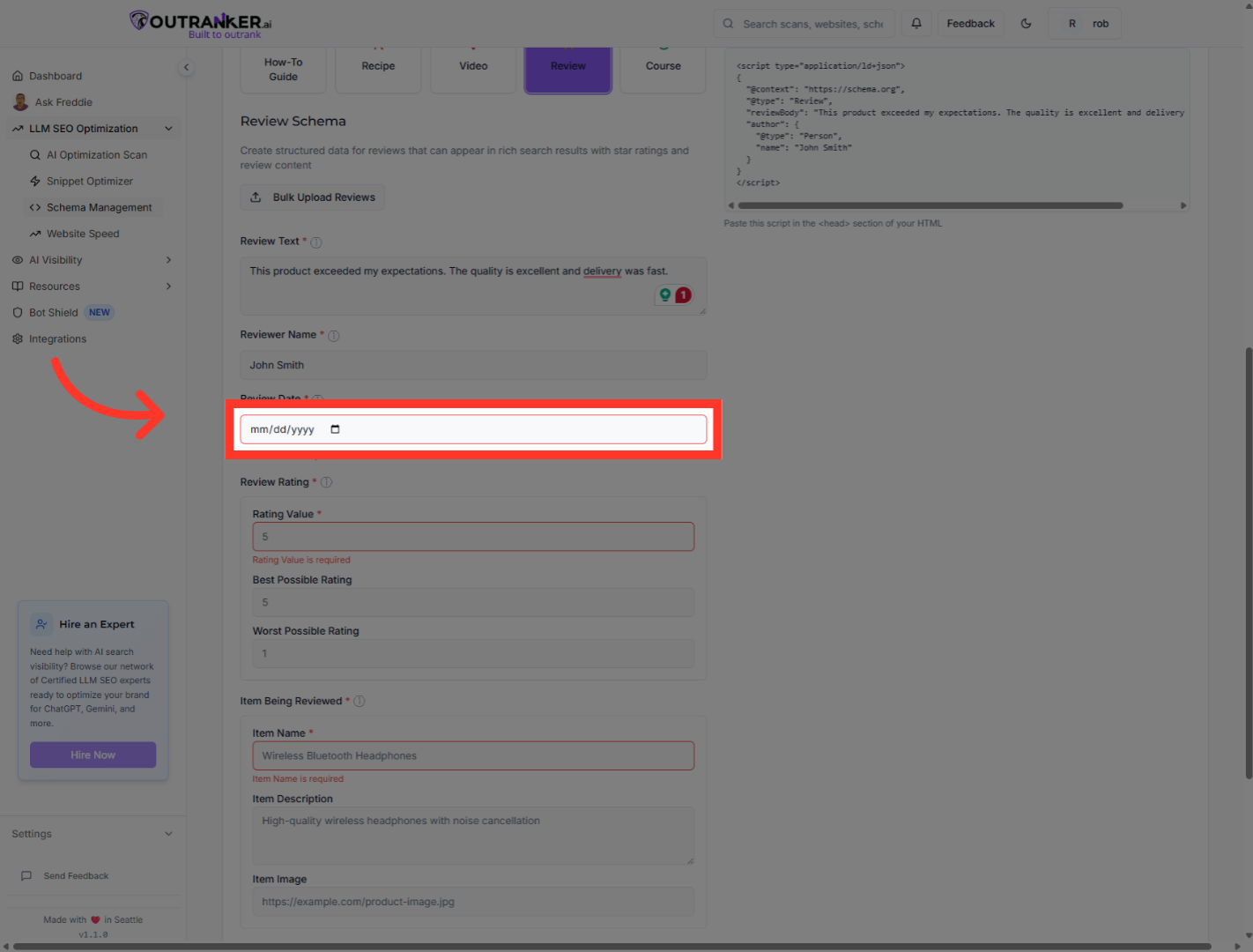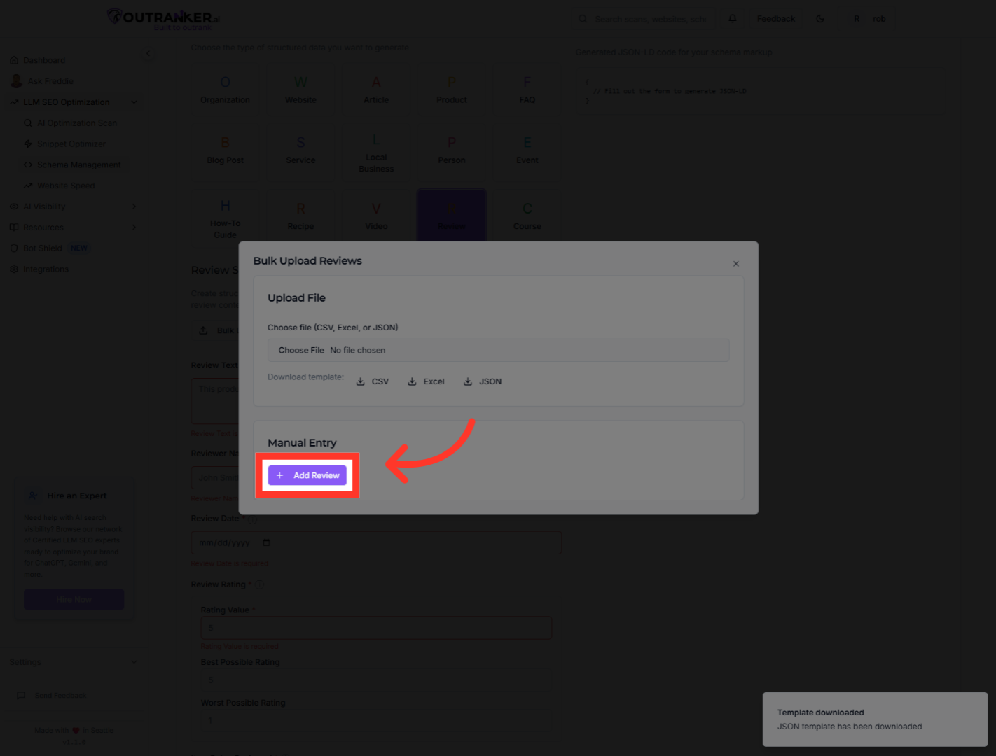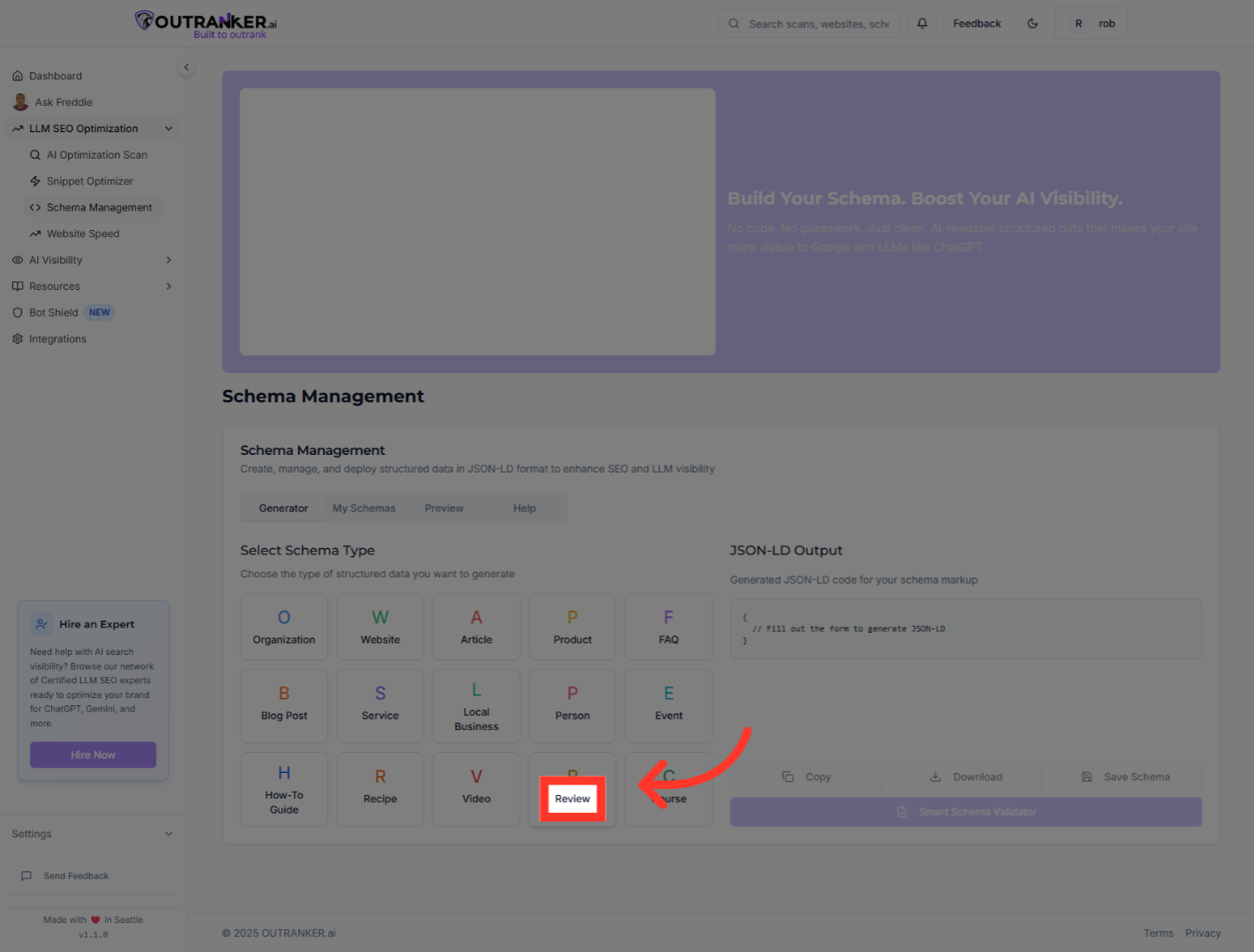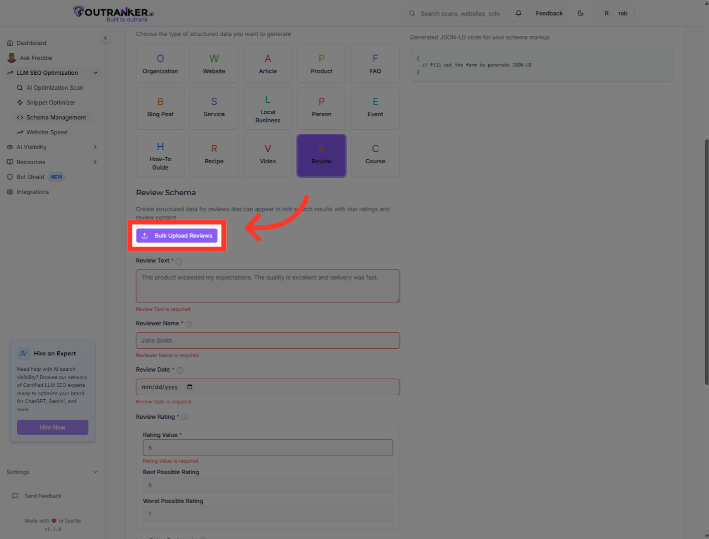 This tutorial guides you through generating a review schema using Outranker's Schema Management feature