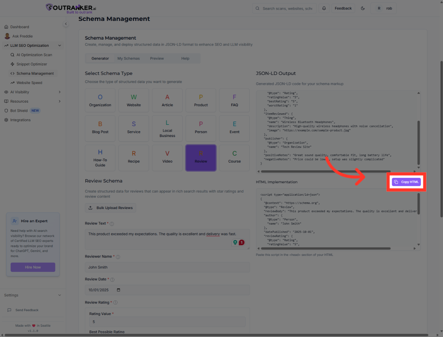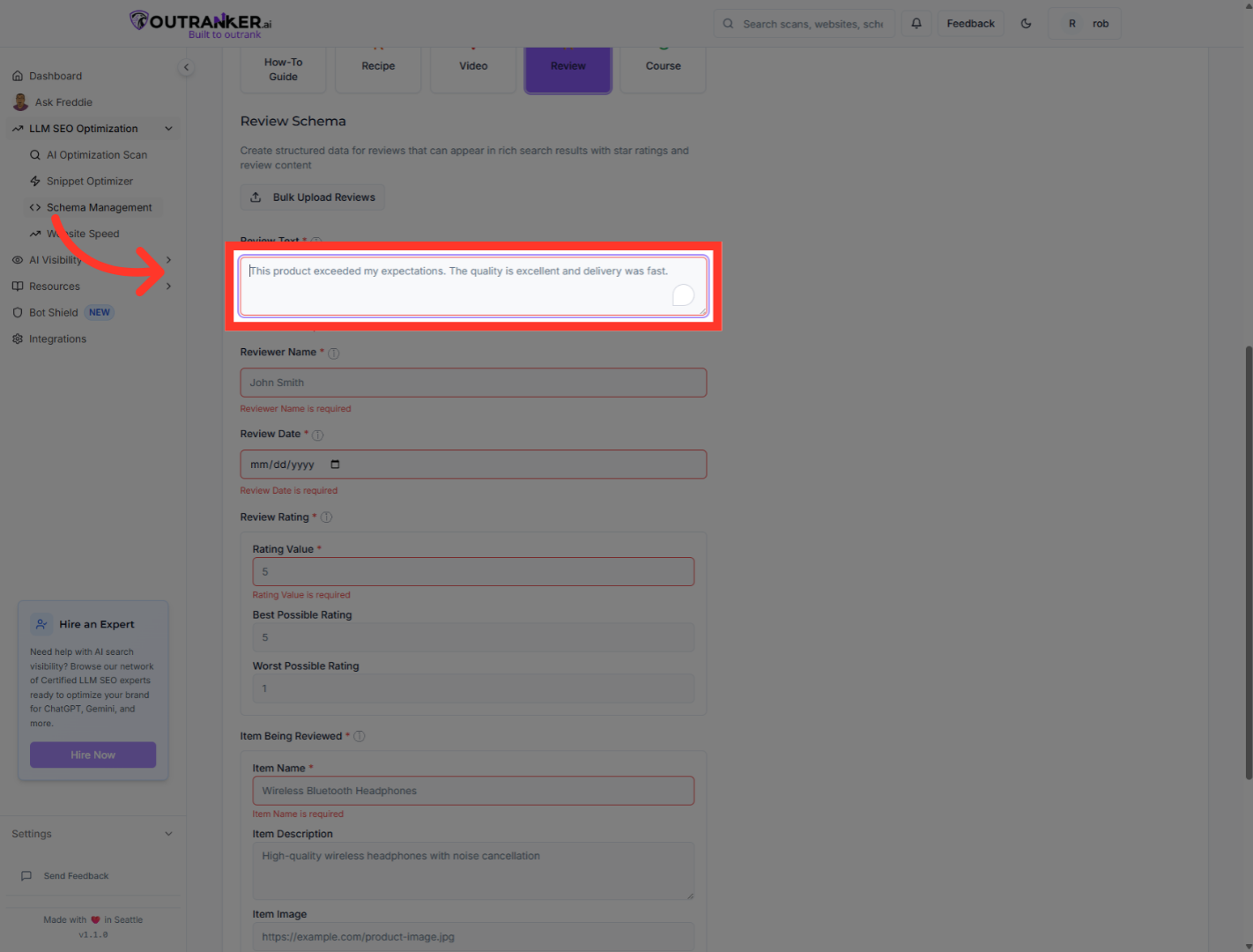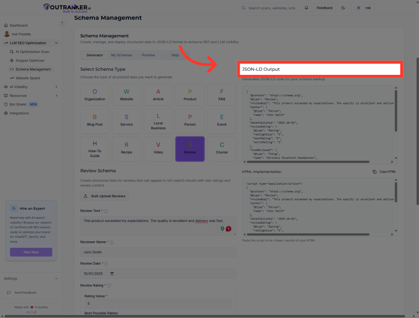 This tutorial guides you through generating a review schema using Outranker's Schema Management feature