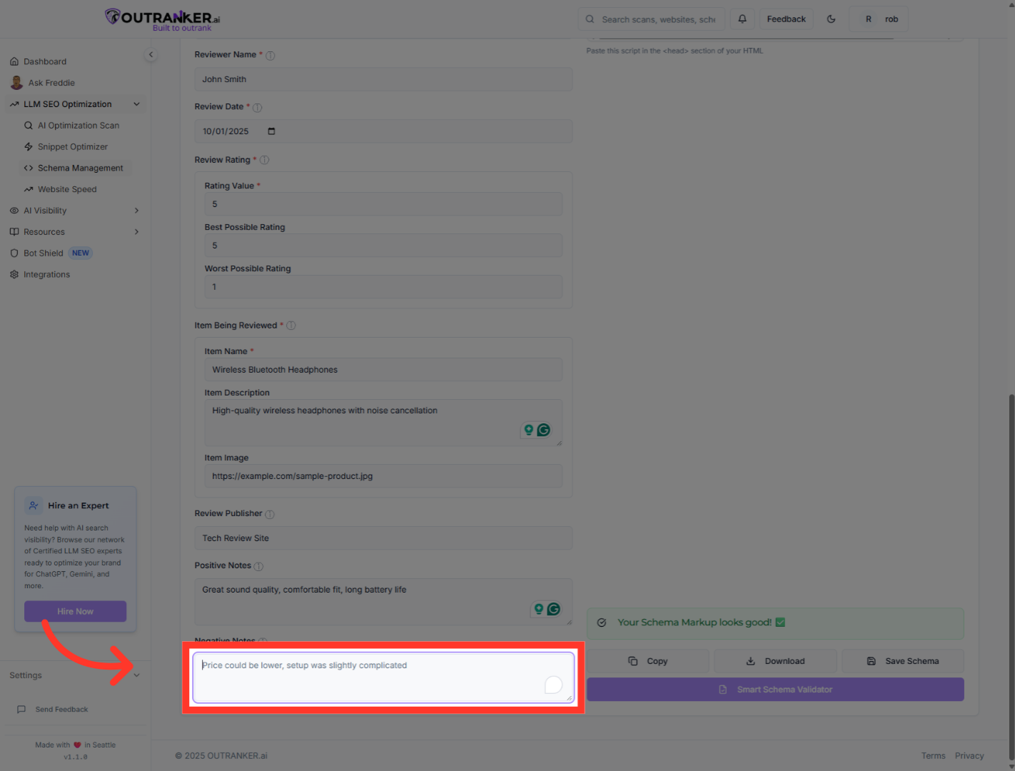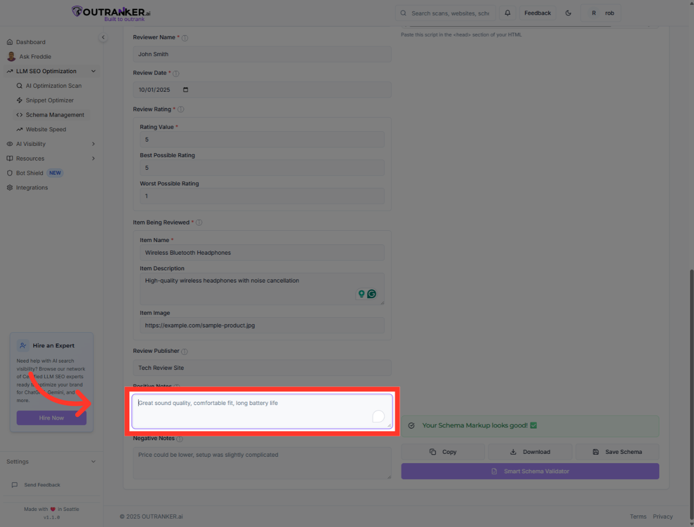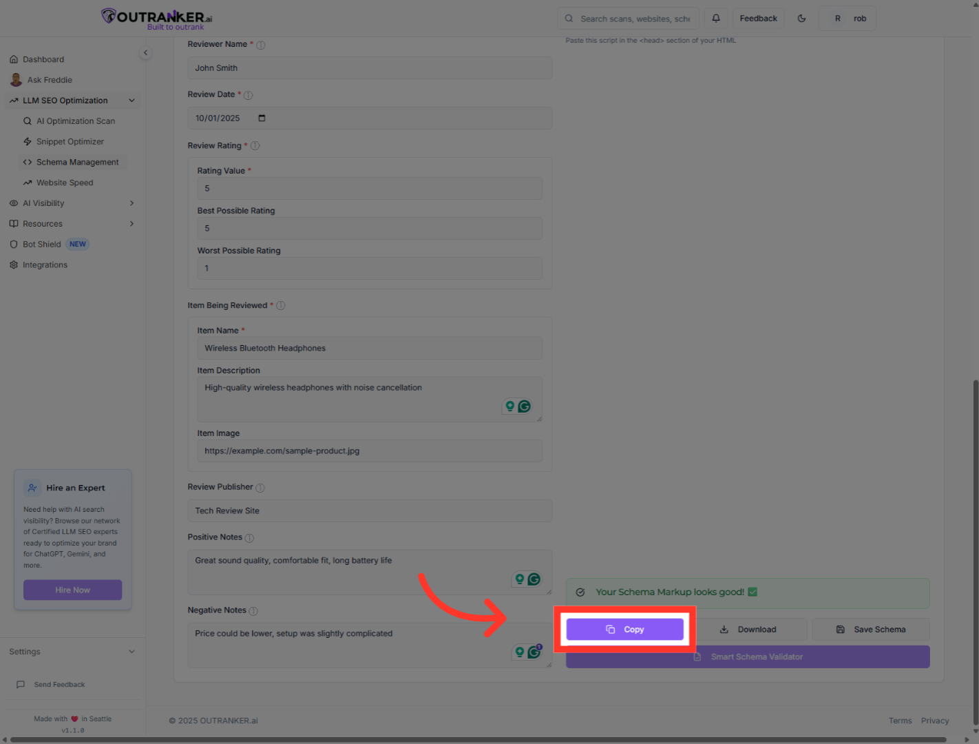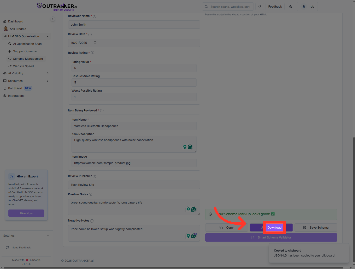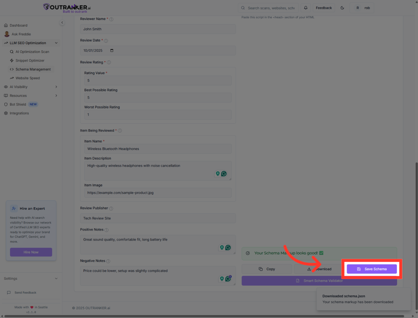 You have successfully generated and saved a review schema using Outranker Schema Management. The process included uploading or manually entering review details, generating JSON-LD markup, and saving the schema for use. To further enhance your SEO, consider creating additional schema types or integrating the markup into your website.