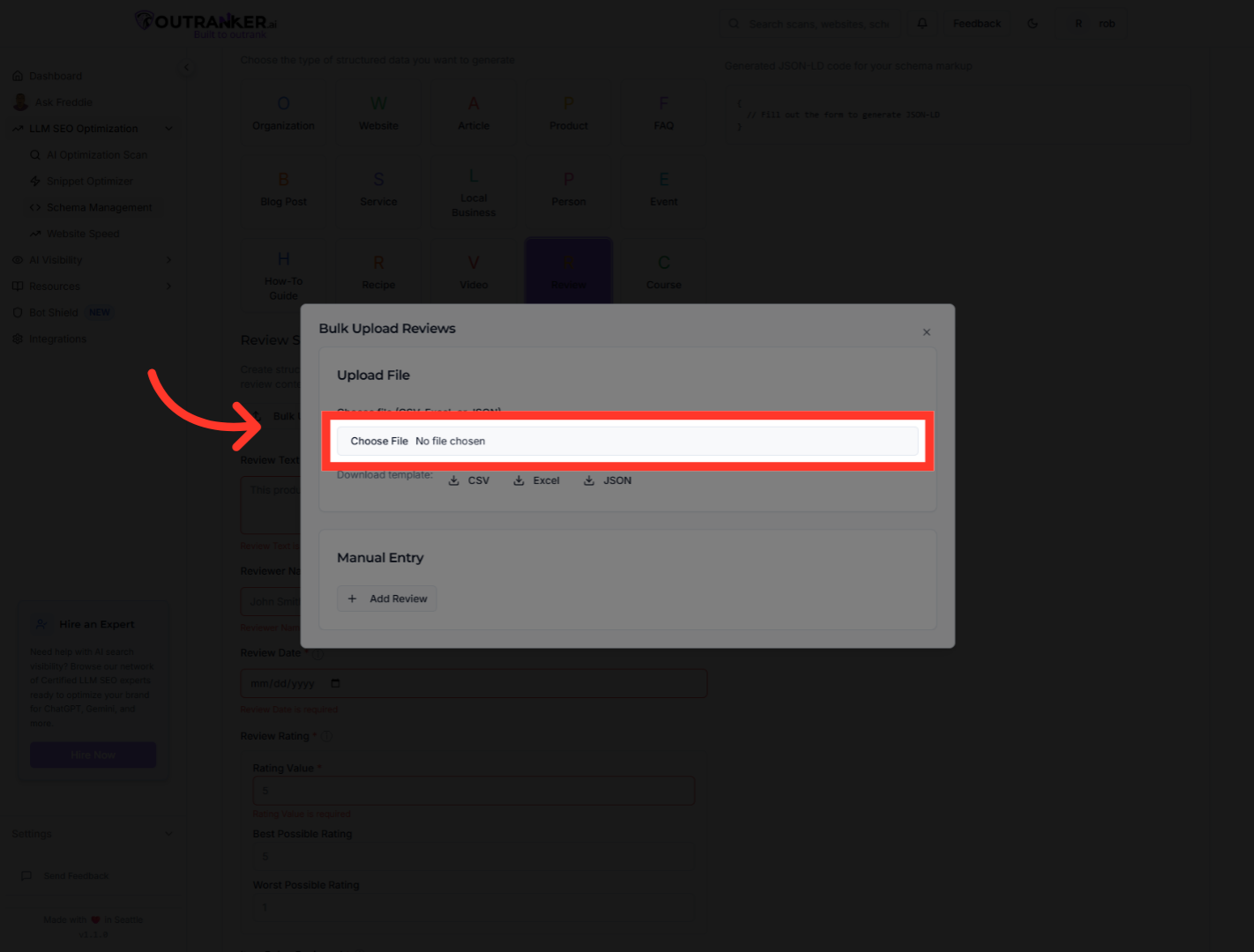 Choose "Bulk Upload Reviews" to upload multiple reviews at once for schema generation.