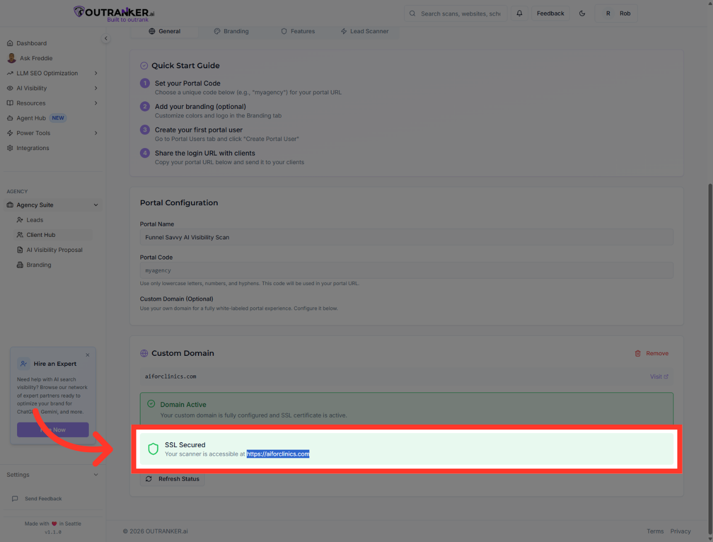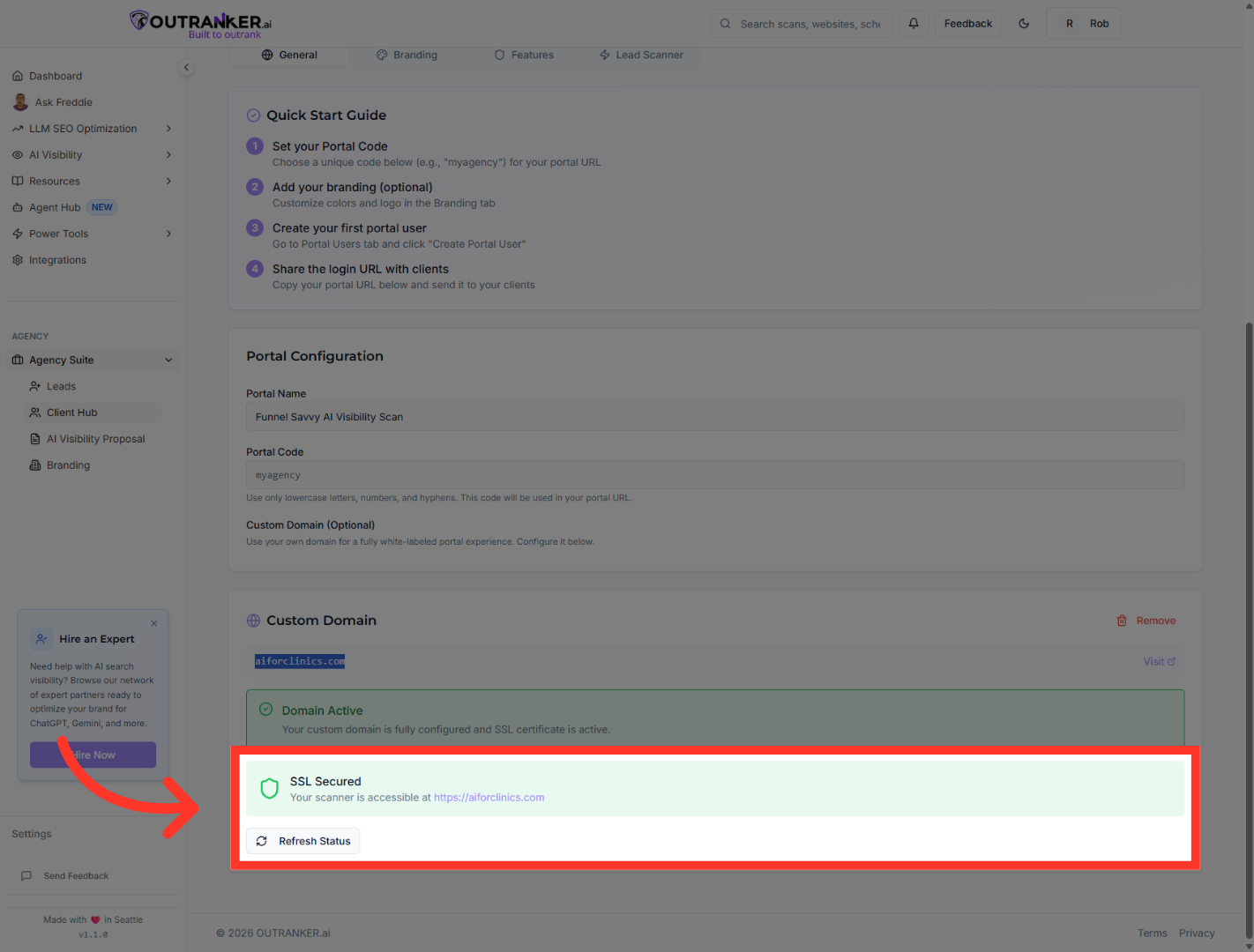 “Click your custom domain link to visit the portal and confirm everything is working correctly.” “Your AI visibility scanner is now accessible through your own branded domain.”