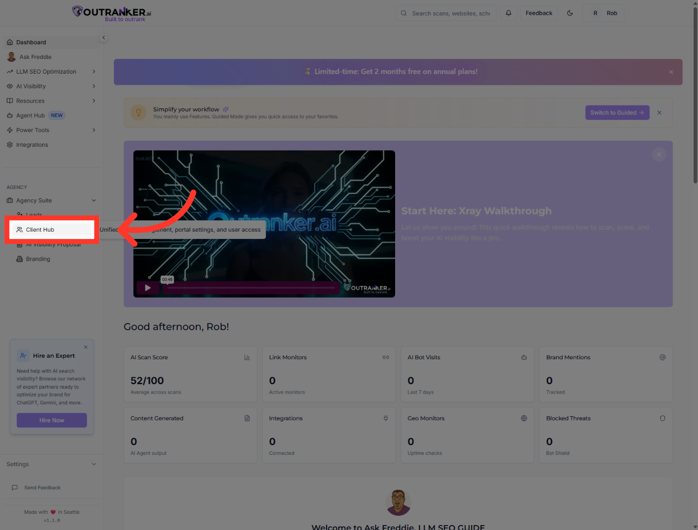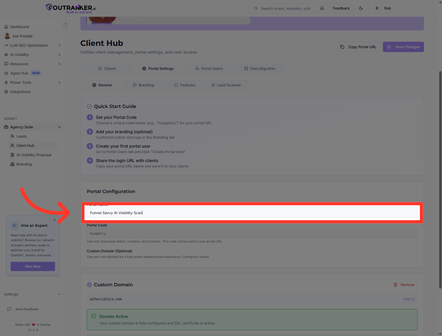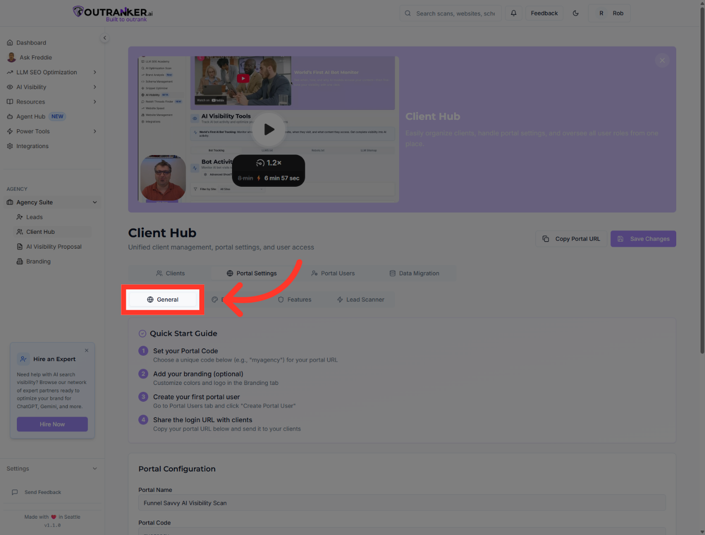 “Start by logging into your Outranker.ai account.” “From the left-hand menu, click Agency Suite, then open Client Hub.” “Inside Client Hub, click Portal Settings to access your portal configuration.”