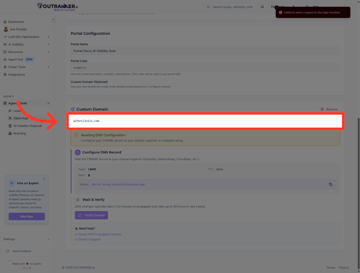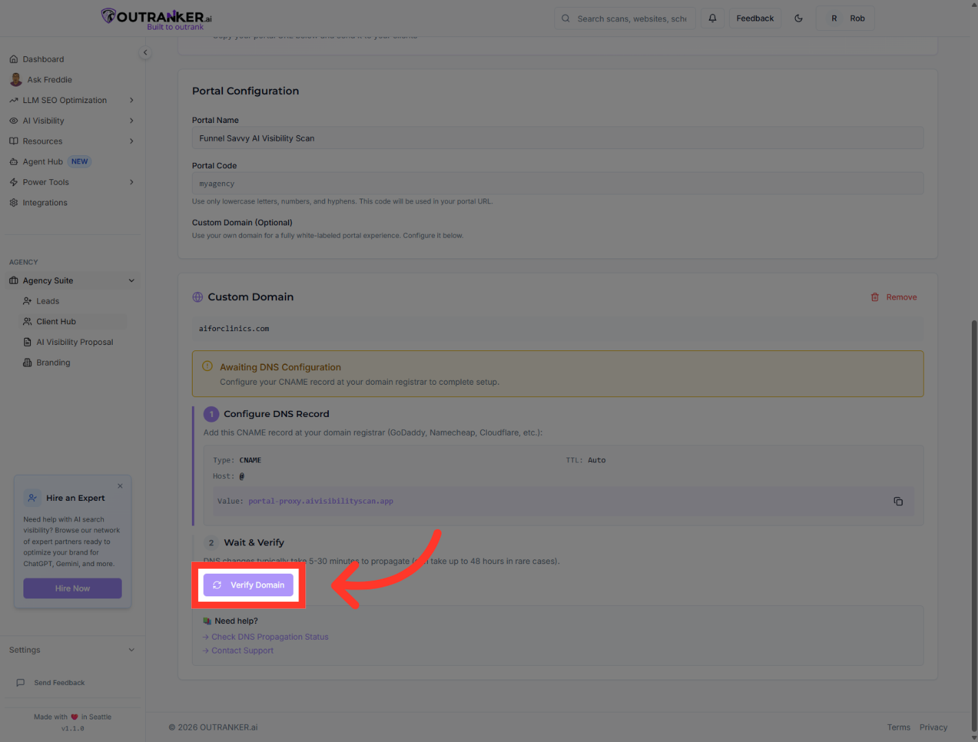 “Back in the Agency Suite portal, click Verify Domain.” “Outranker will check your DNS configuration and confirm the connection. Please note, it may take some time for the DNS settings to propagate properly.”