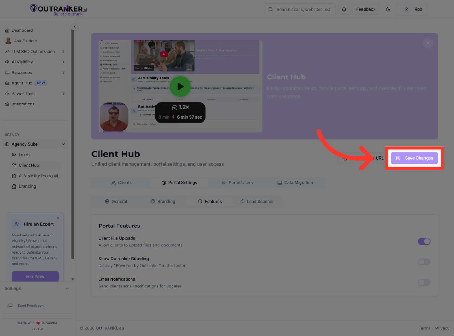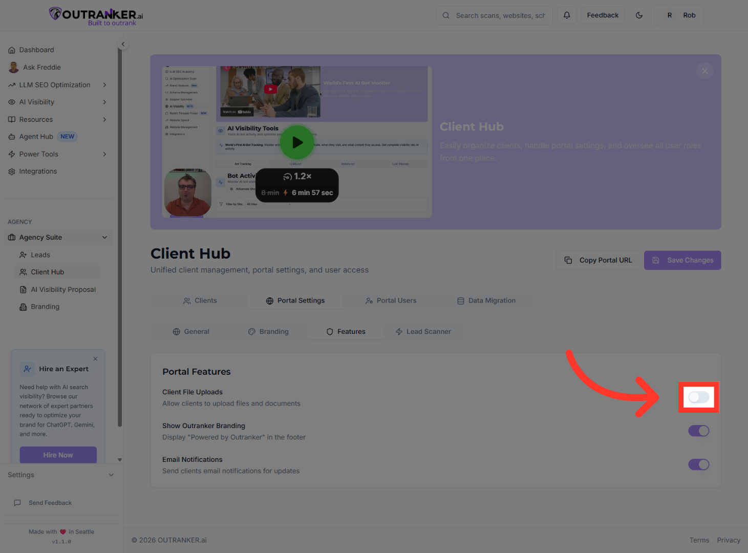 “Start by logging into your Outranker.ai account.” “From the left menu, click Agency Suite, then open Client Hub.” “Inside Client Hub, click Portal Settings to access configuration options.”
