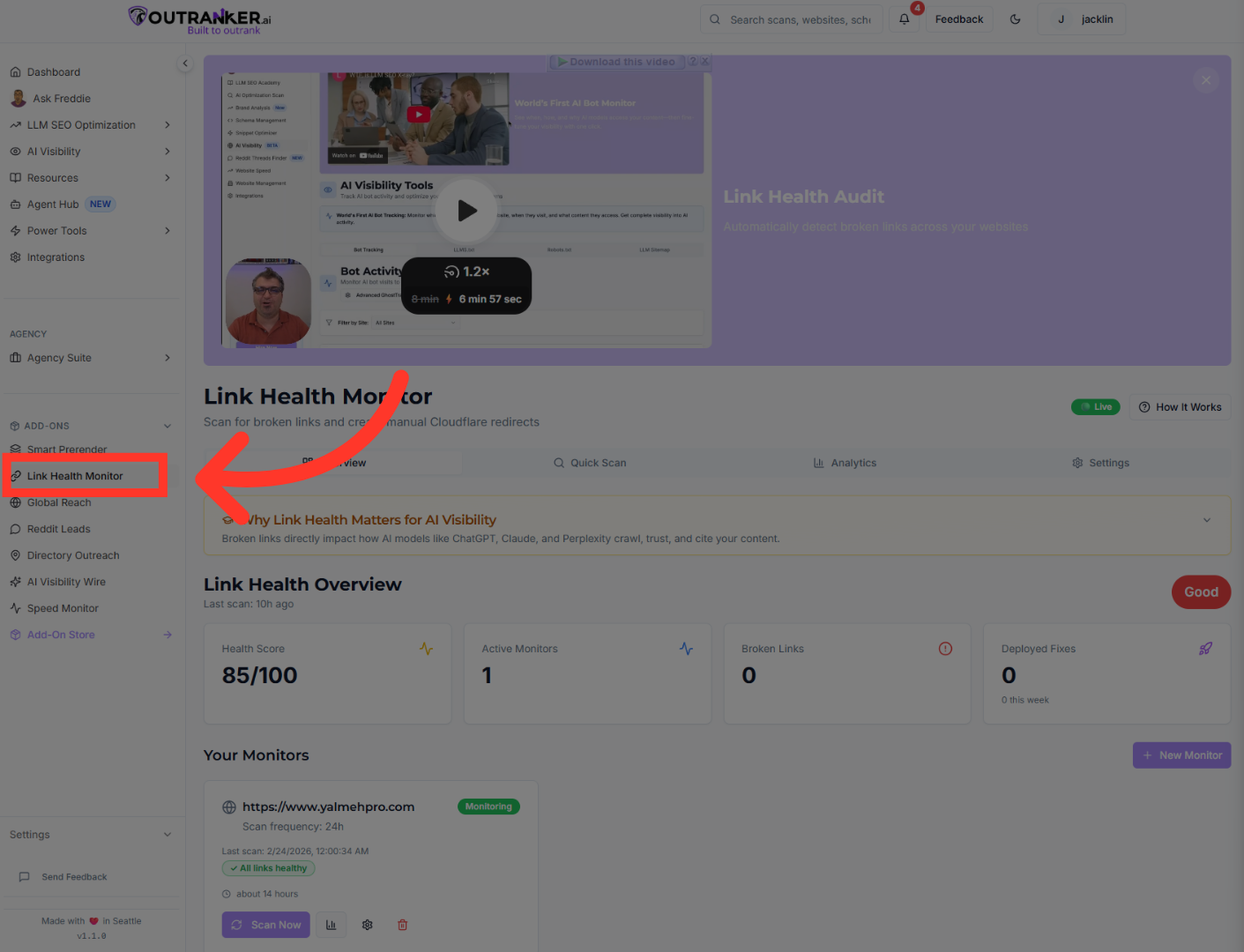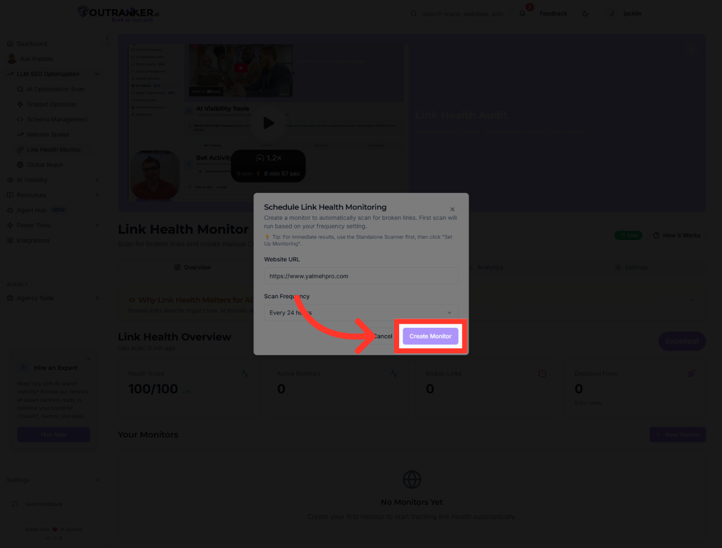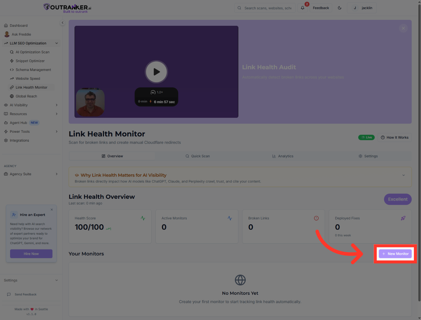 “In this video, you’ll learn how to create a new monitor and run a quick scan using Link Health Monitor inside Outranker.” “Broken links and crawl issues don’t just hurt traditional SEO — they reduce your credibility in AI-powered search systems.” “Let’s set up monitoring and analyze your site’s link health step by step.”