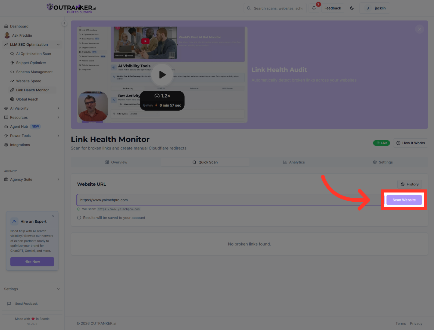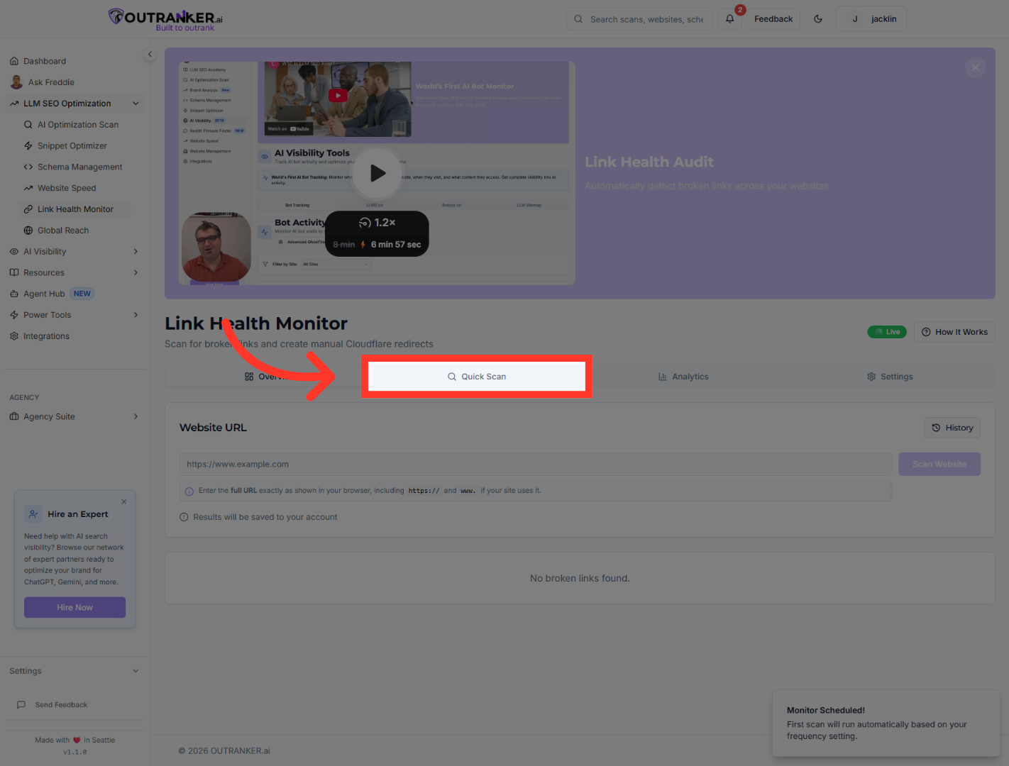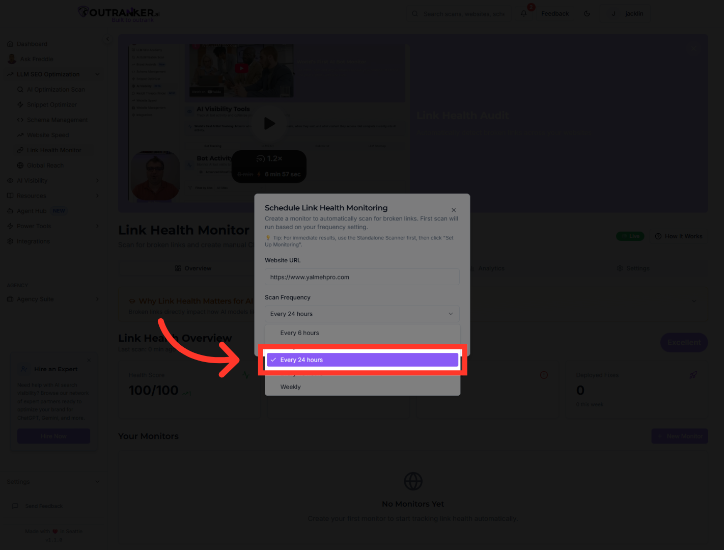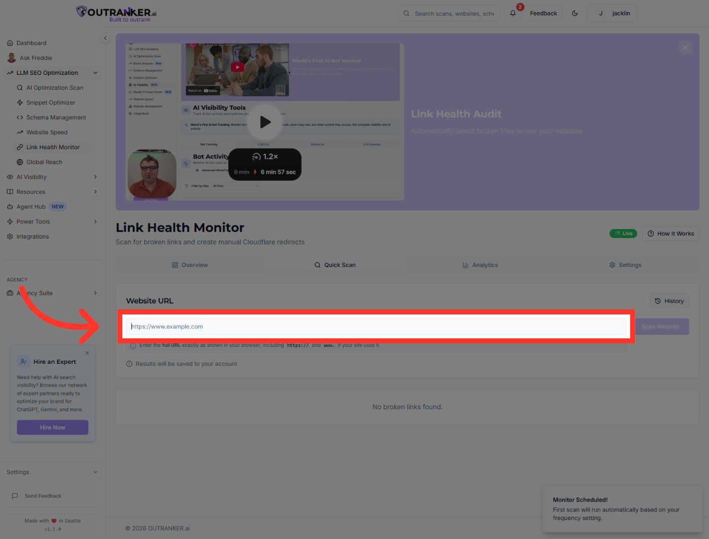 “In this video, you’ll learn how to create a new monitor and run a quick scan using Link Health Monitor inside Outranker.” “Broken links and crawl issues don’t just hurt traditional SEO — they reduce your credibility in AI-powered search systems.” “Let’s set up monitoring and analyze your site’s link health step by step.”