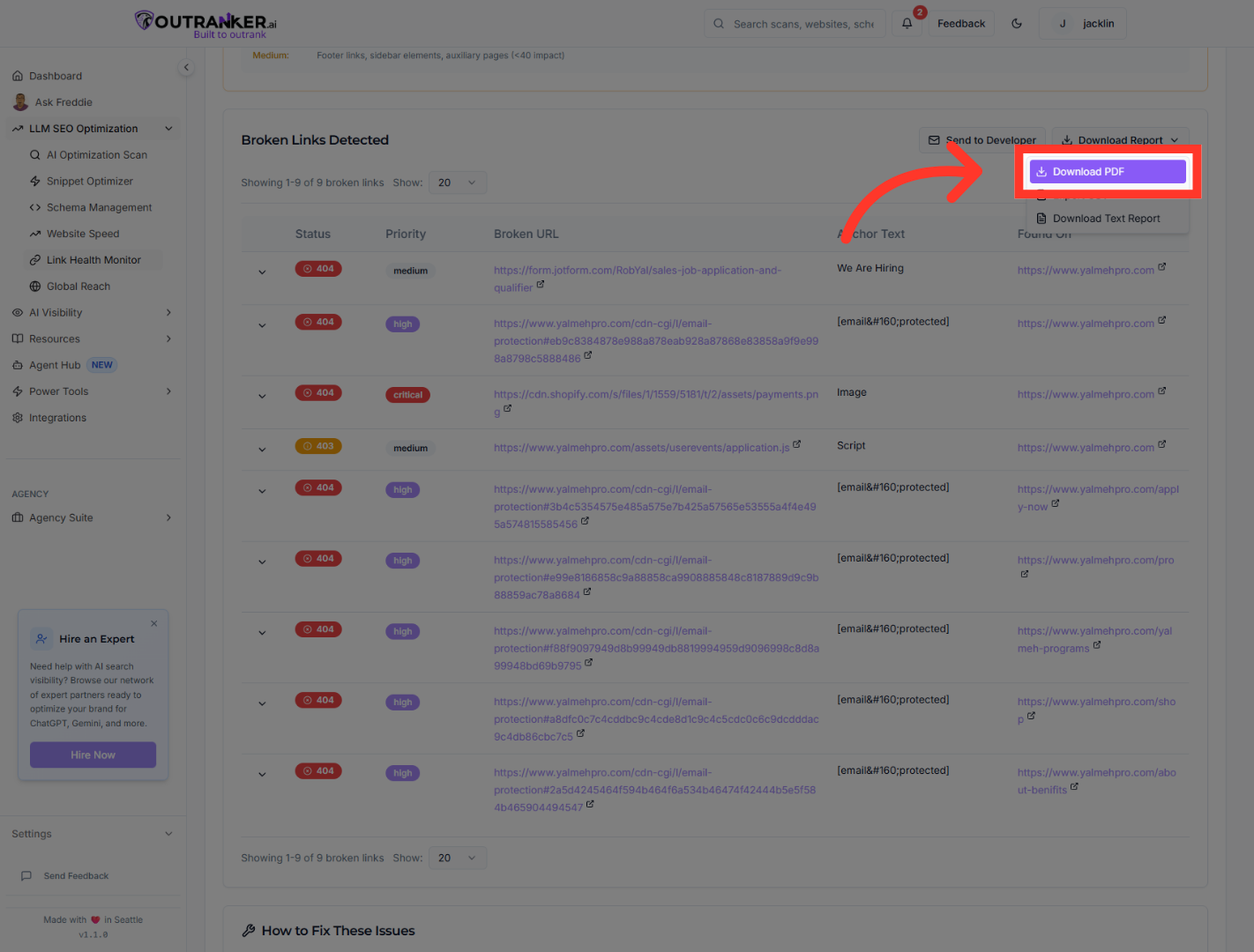 “You can download a full PDF report for offline review.” “Use the Step-by-Step Fix Guide to resolve issues systematically.” “Update broken links directly by replacing outdated URLs.”