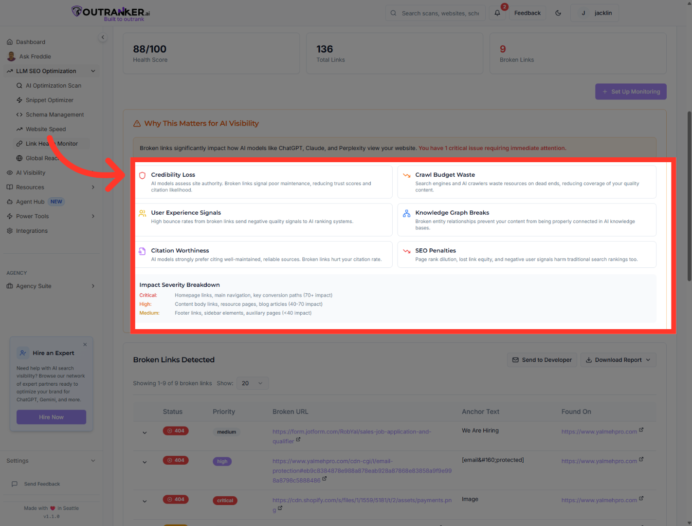 “Broken links reduce site credibility.” “They waste crawler resources, preventing search engines and AI systems from fully indexing your quality content.” “They increase bounce rates and send negative quality signals.” “They break entity relationships in AI knowledge systems.” “And they reduce citation rates in AI-generated responses.” “All of this affects both AI visibility and traditional search rankings.