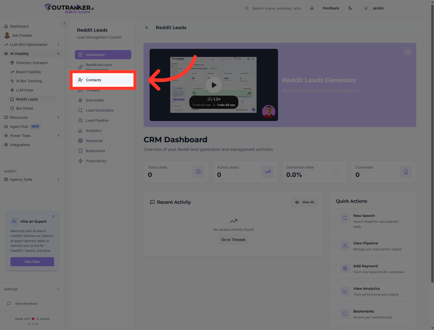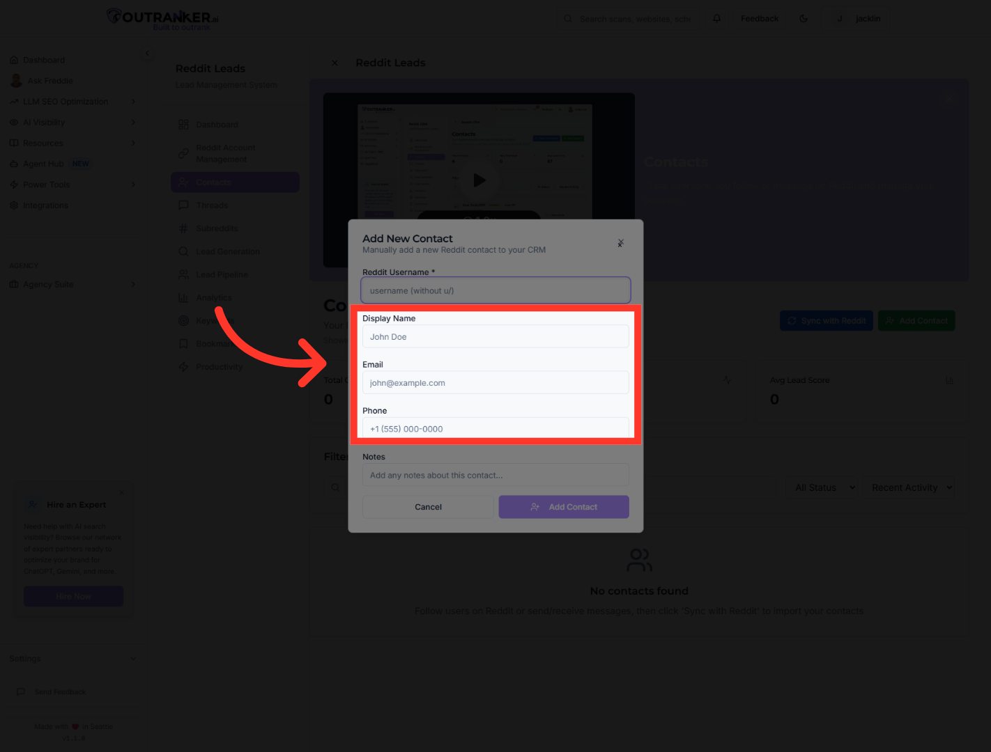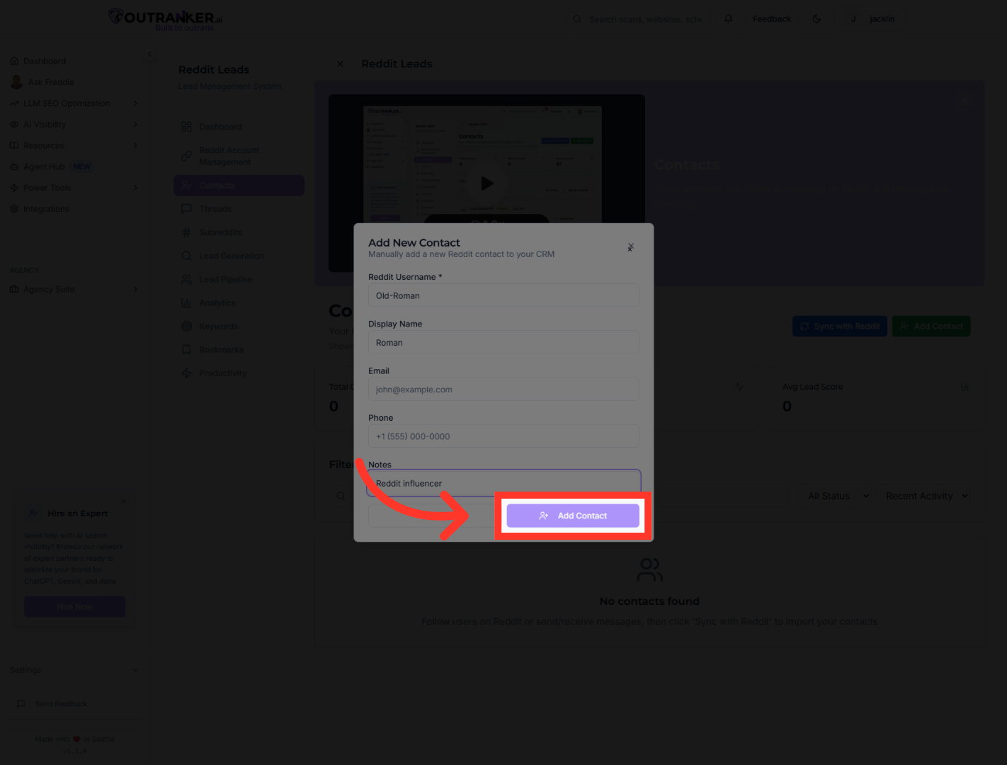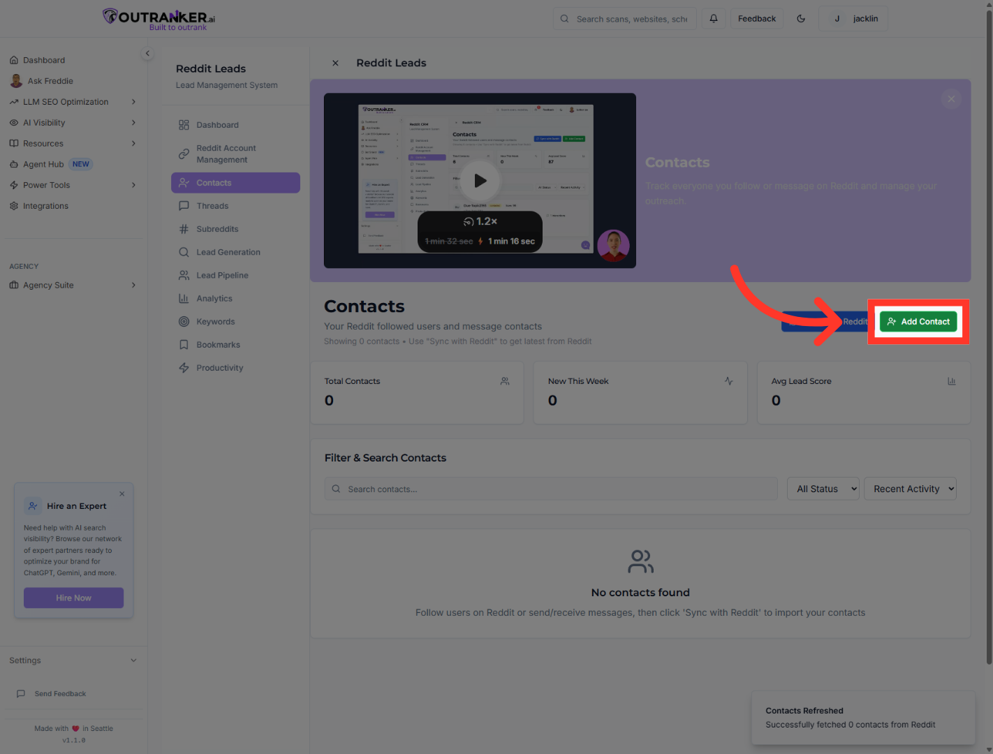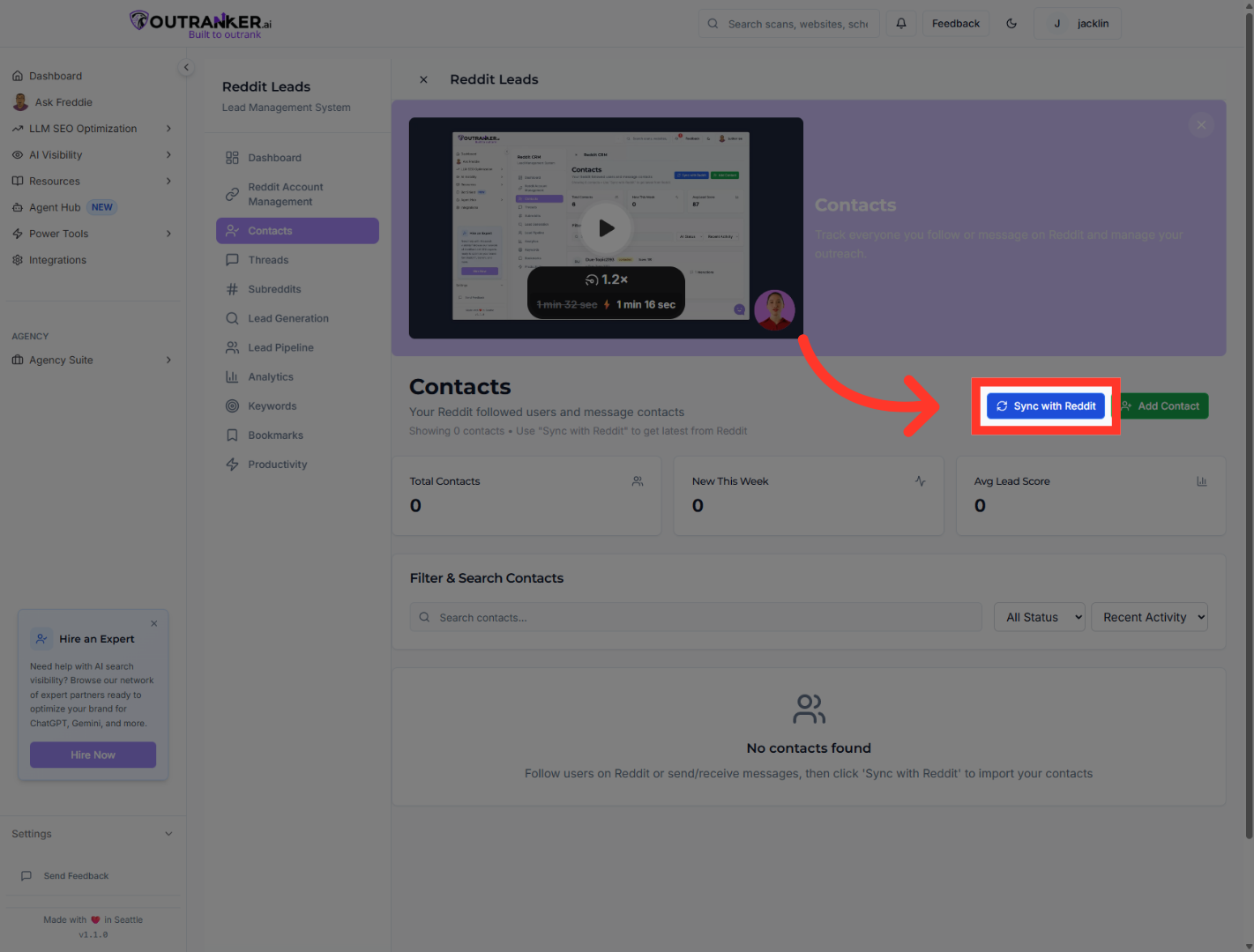 This tutorial explains how to sync and add a Reddit contact within the Reddit leads section of AI Visibility.