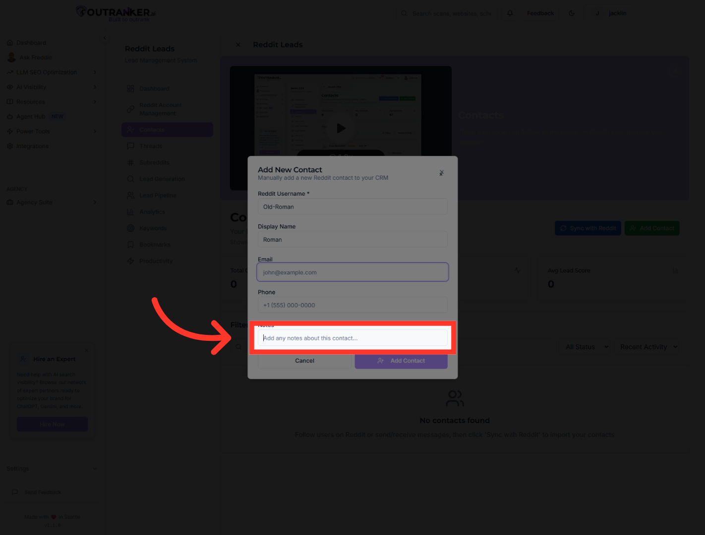“In the Notes section, add relevant details such as ‘Reddit influencer,’ ‘Active commenter,’ or campaign-specific context.” “This helps categorize and prioritize contacts later.”