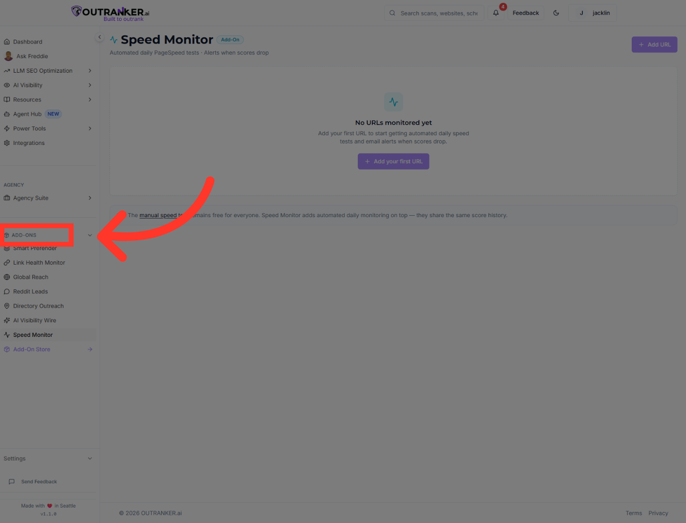 Click "Add-Ons" to access the SEO optimization features within Outranker, which is the starting point for measuring your website speed.