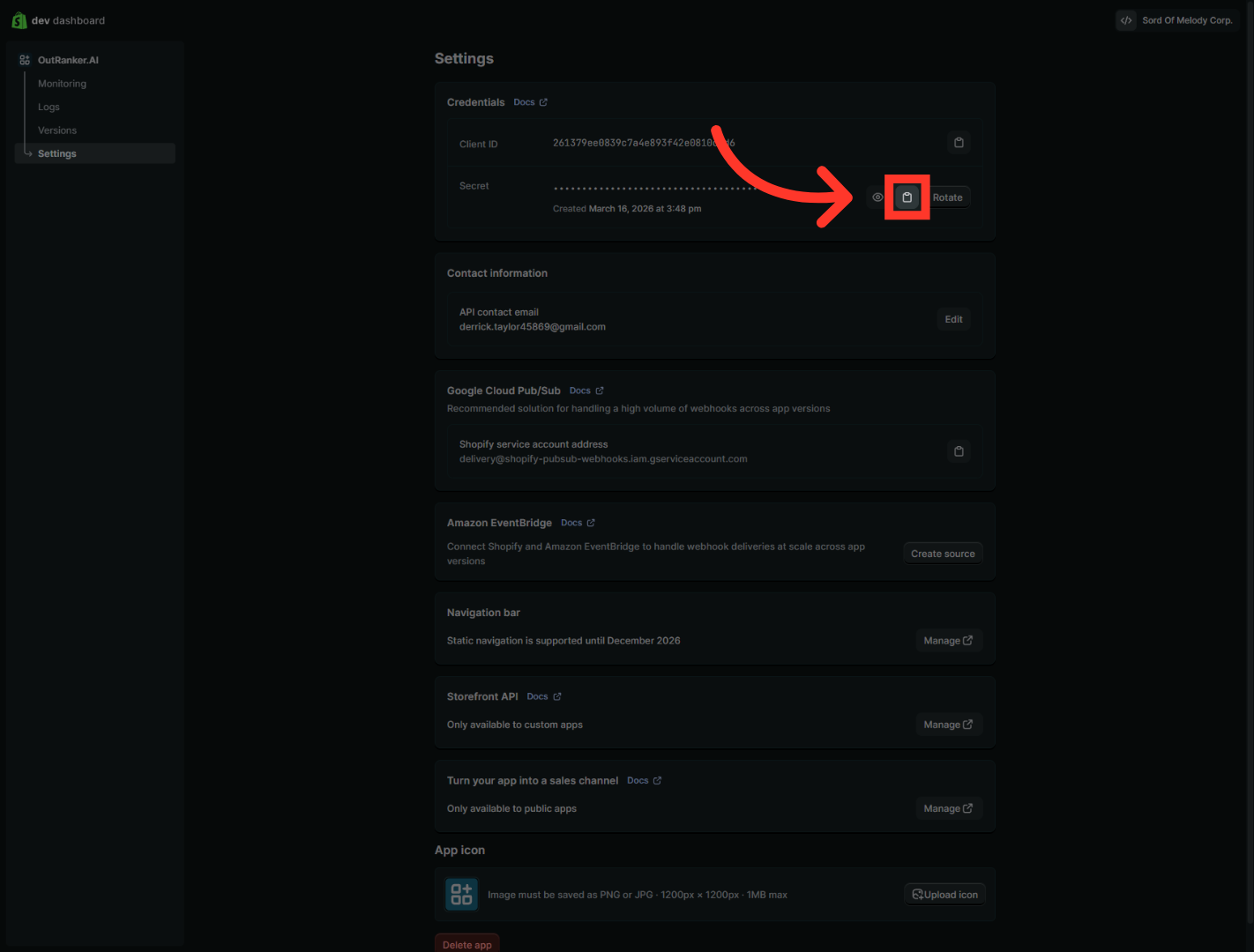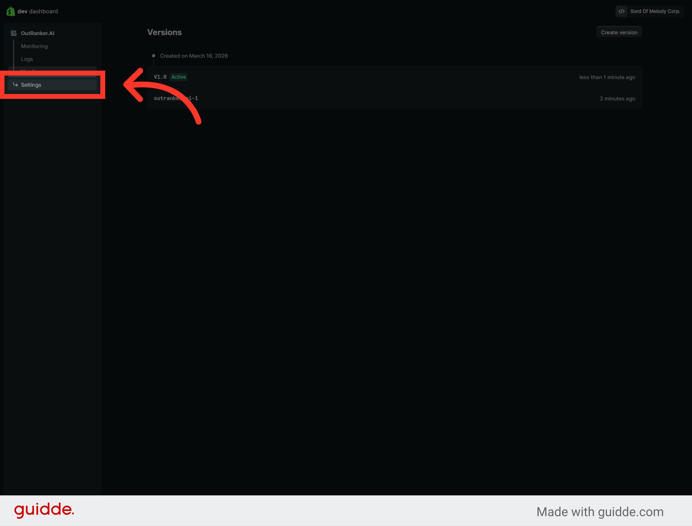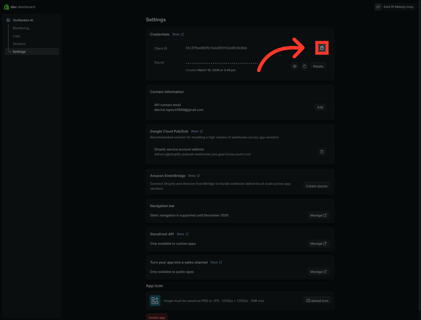 “After the app version is live, open the API credentials section. ”Click "Settings" to access app configuration options. This is where Shopify gives you the client details needed to finish the connection in Outranker.