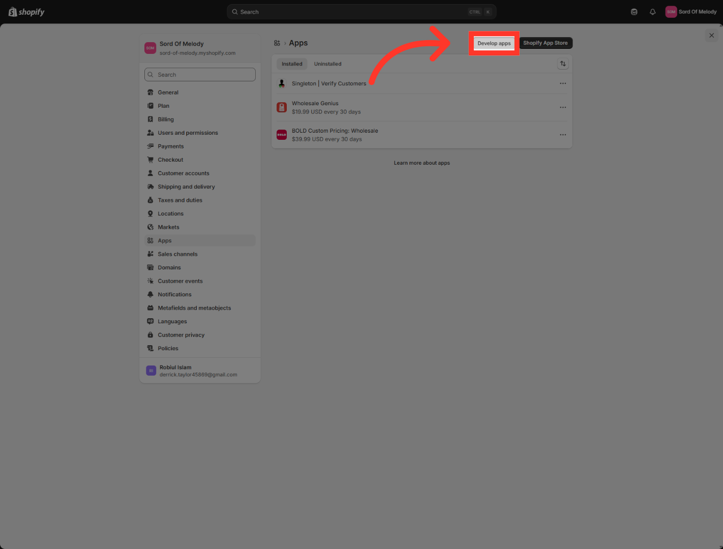 Go to Apps, then open Develop apps so you can create a custom app for this integration. This app acts as the secure bridge between Shopify and Outranker. Instead of using a shared connection, you’re creating a store-specific setup that gives you more control over access and permissions.”
