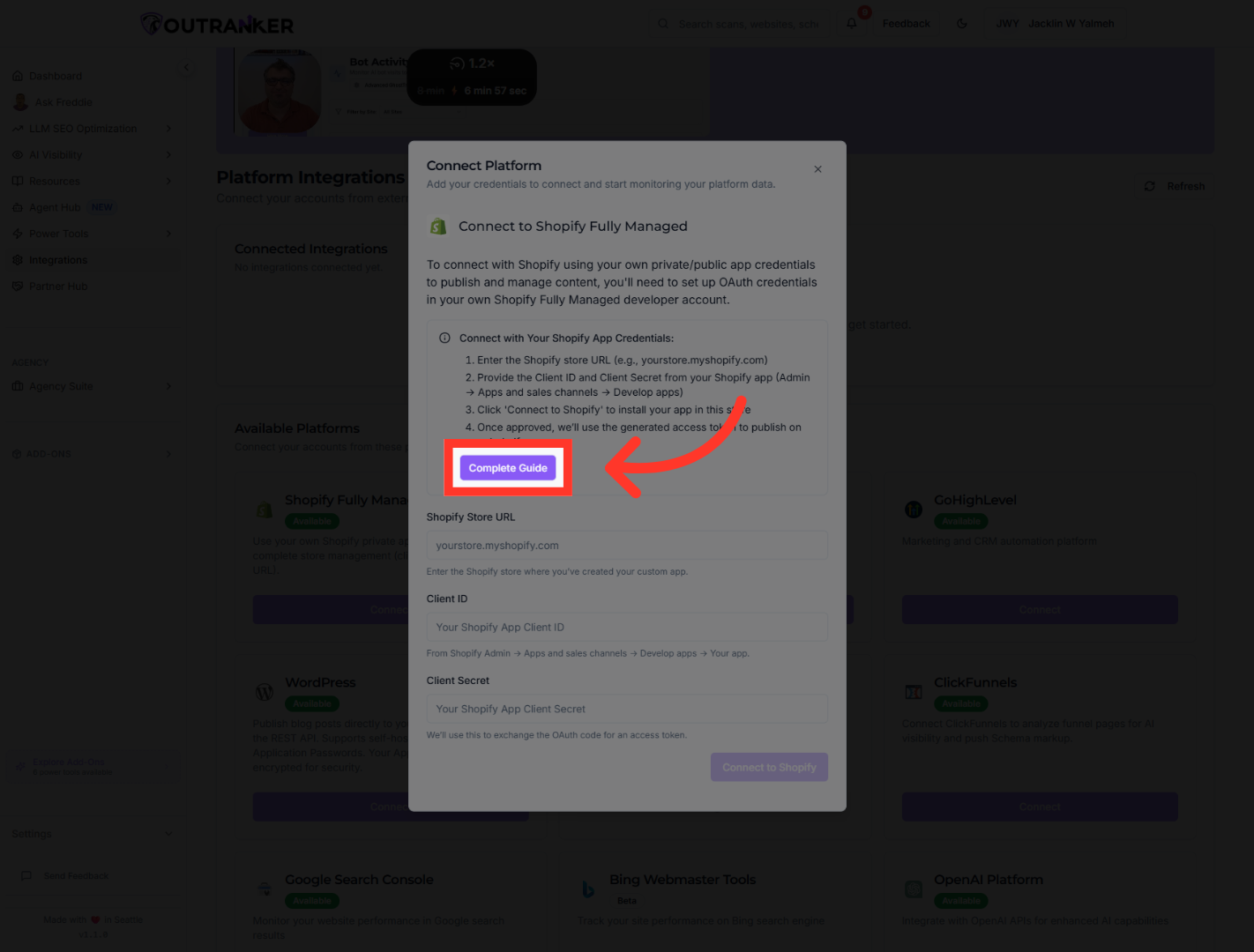 Outranker also provides a Complete Guide, which shows the exact values you’ll need during configuration. This is especially useful because the integration depends on matching settings between Outranker and Shopify.”