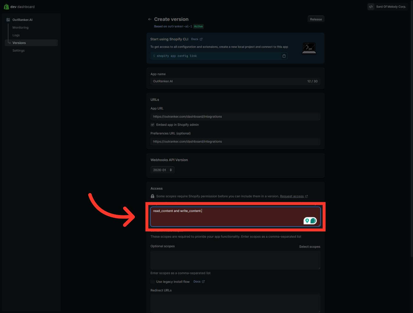 “Next, open the permissions or access scopes section for the app. Here, you need to enable the required access for Outranker.” “Turn on read_content. This allows the app to read the content it needs from your Shopify store.” “Then turn on write_content. This allows the app to make supported content updates when needed as part of the integration.”