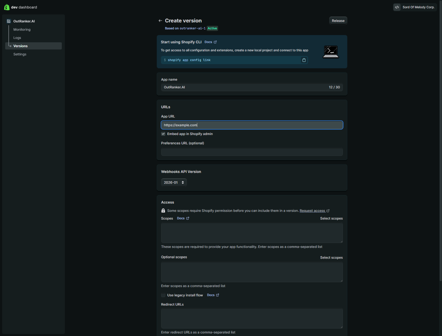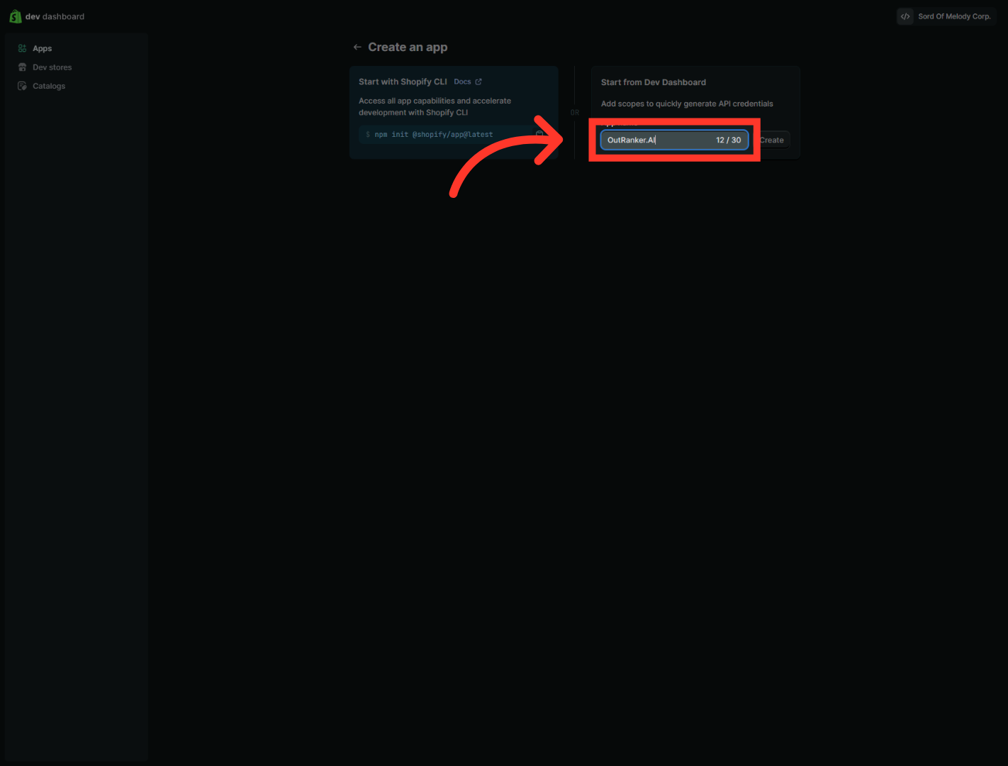 When Shopify asks for the app name, enter OutRanker.AI. Then confirm to create the app.”
