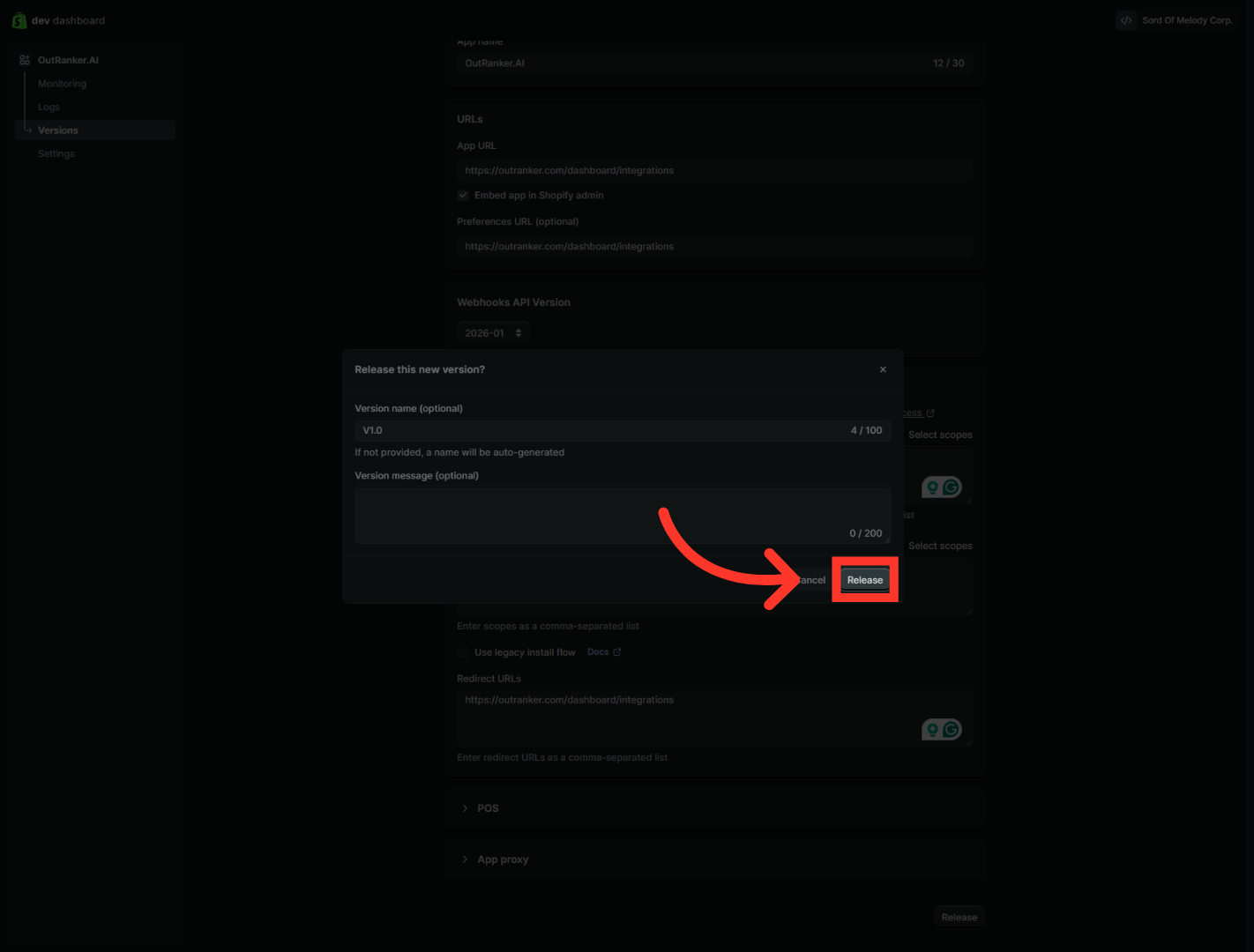 “Release or publish the app version to make it live. Shopify may ask you to enter a version name before publishing. Once the version is released, your app setup becomes active.”