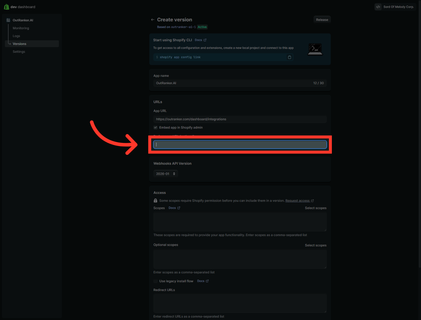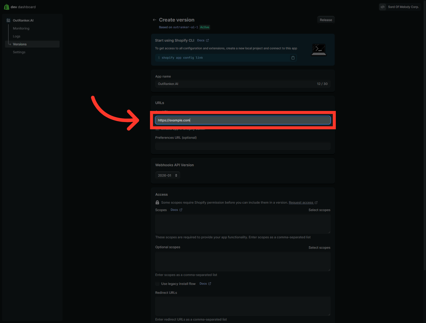 “Go back to the Outranker guide. Find the App URL value. Copy it. Then return to Shopify and paste it into the App URL field.”