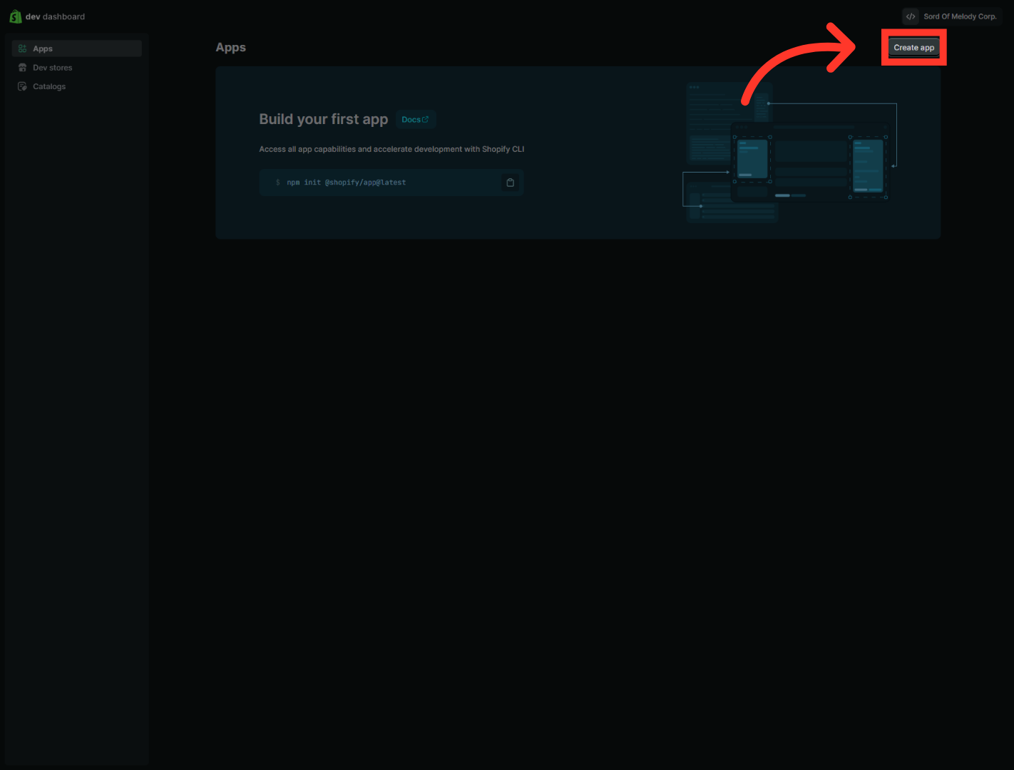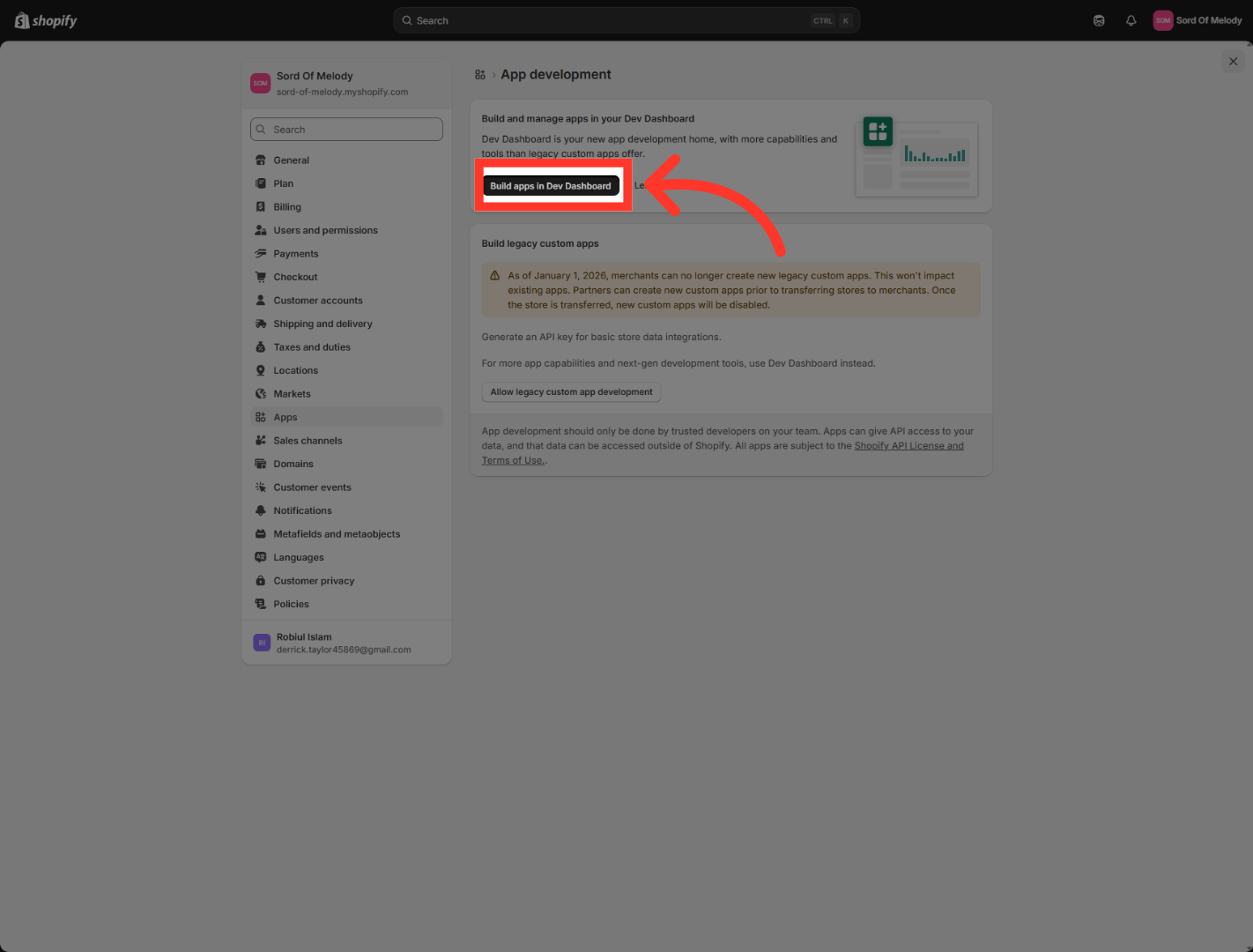 “Now click "Build apps in Dev Dashboard" to create a new app.