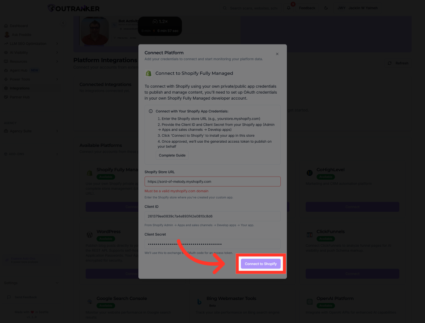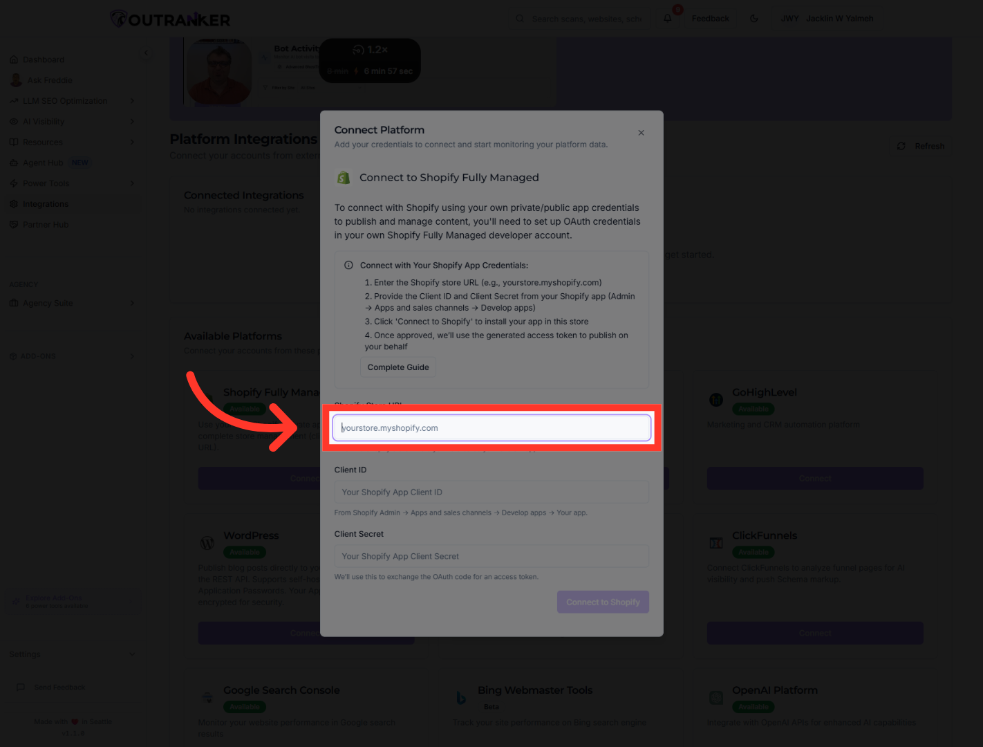 This tutorial guides you through connecting your Shopify store with the Outranker AI SEO Optimization Platform.