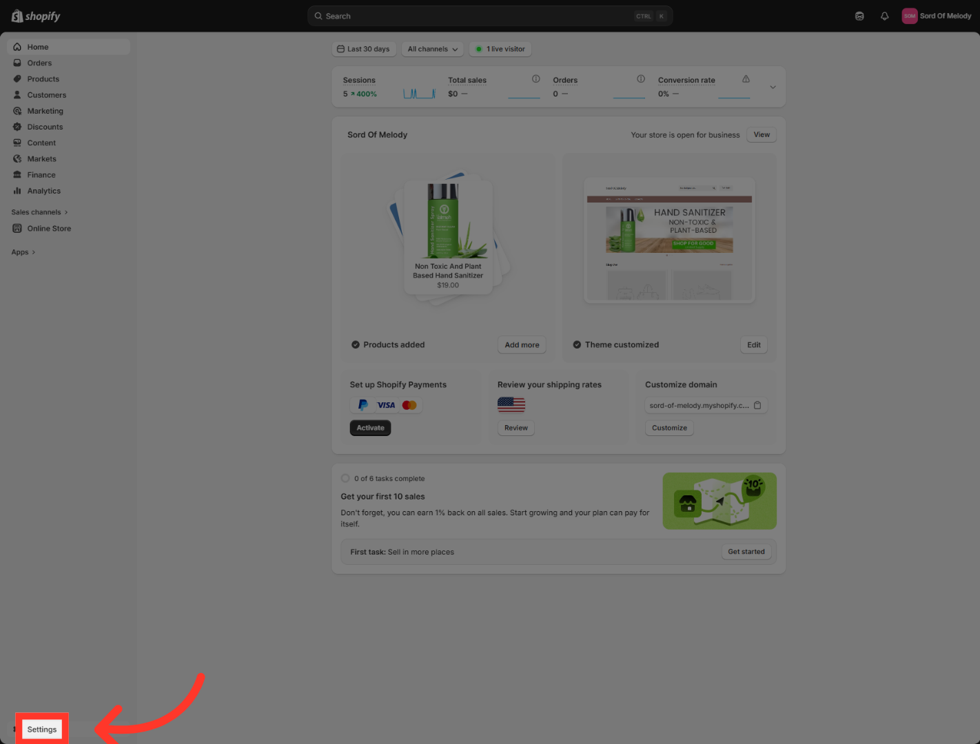 “Next, switch to your Shopify admin and open the store you want to connect. Click "Settings" to access the configuration options for your Shopify store.