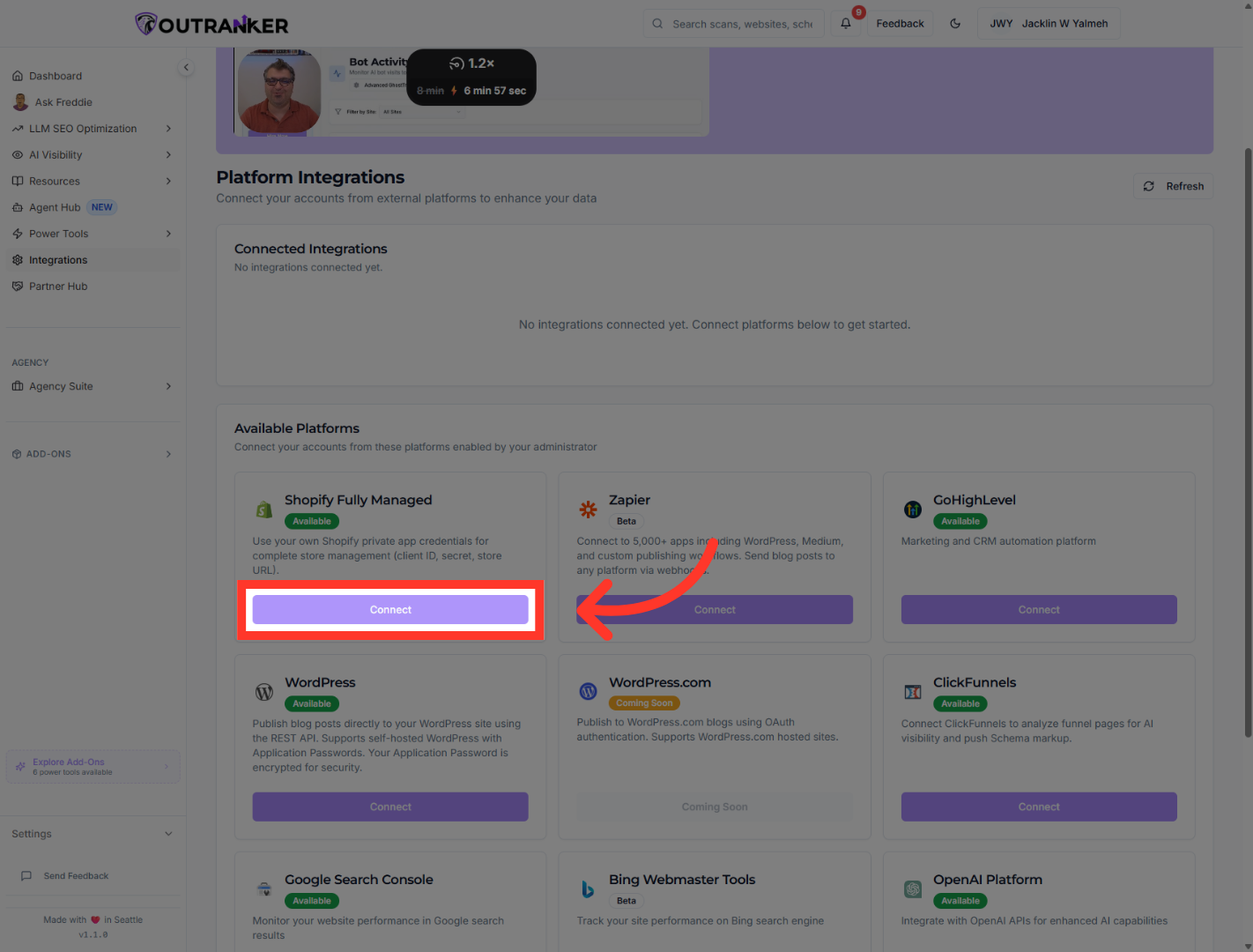 “Begin inside Outranker by opening the Integrations area. From there, find the Shopify integration and click Connect to start the setup.