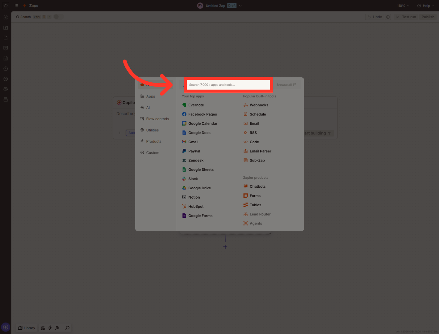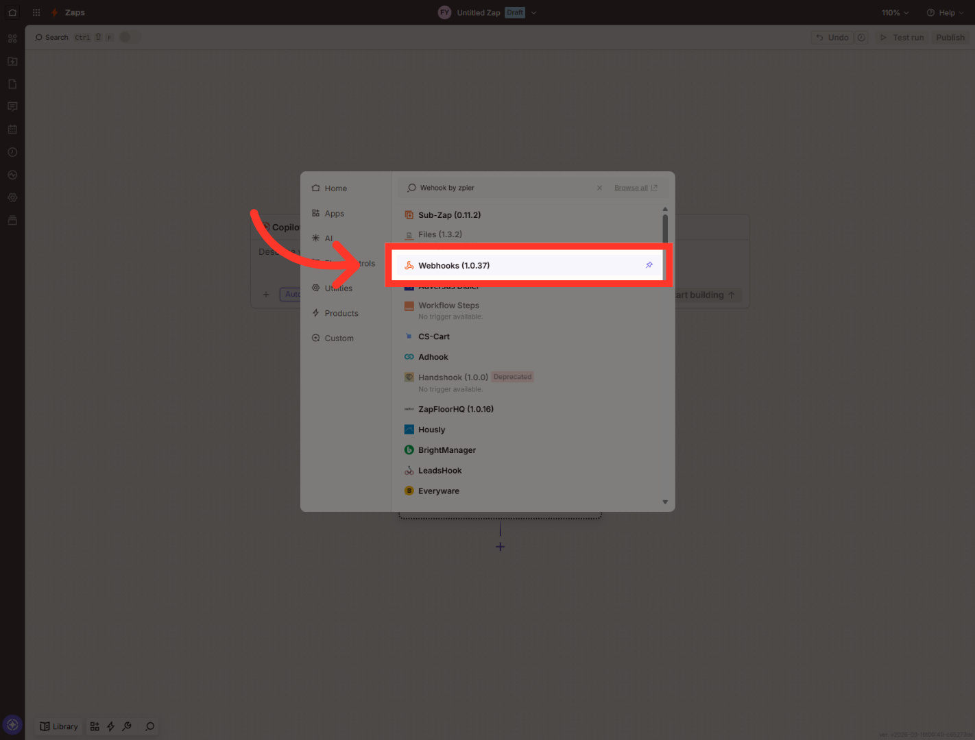 “Click the app search box. Type Webhooks by Zapier. Then select it from the results.”