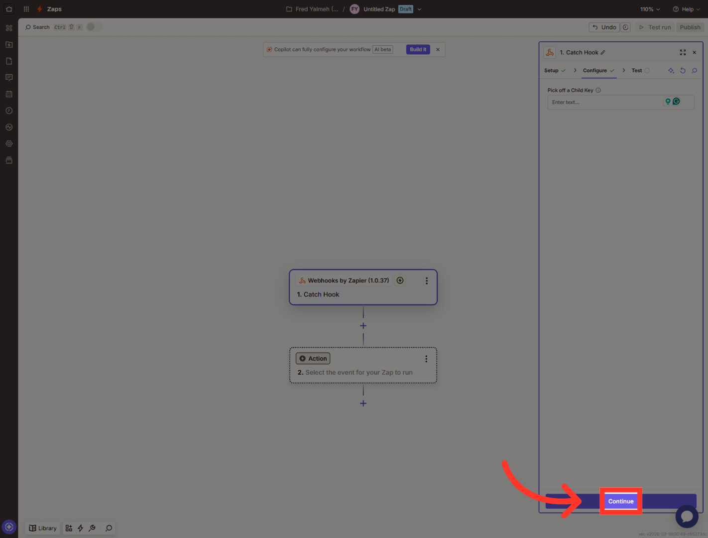Click "Continue" to proceed with the Zap configuration after entering the webhook URL.