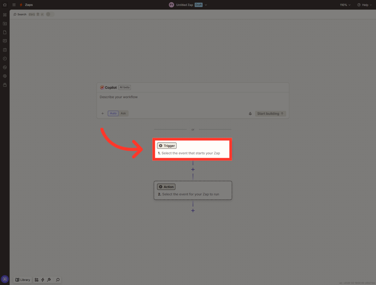“In the new Zap, click the Trigger step. This is where you choose what starts the workflow.”