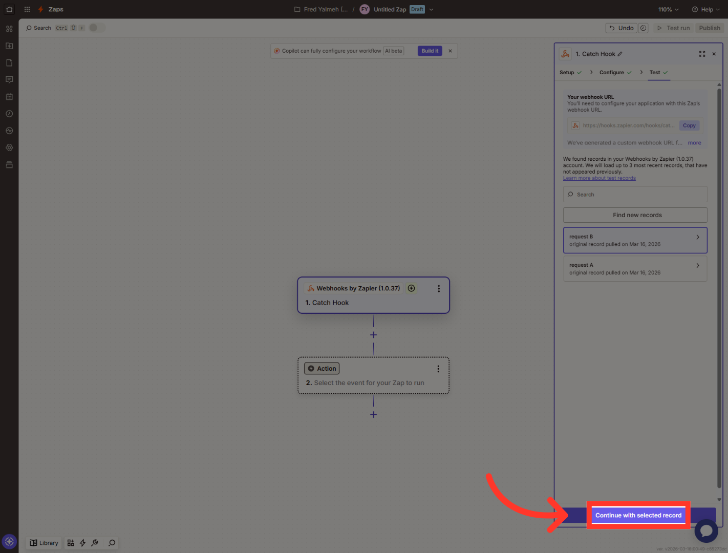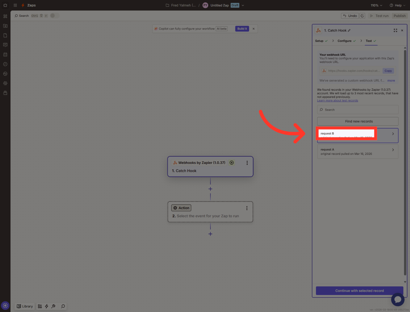 “When Zapier shows the available test records, select request B. This gives Zapier a sample record to use for the next step.”