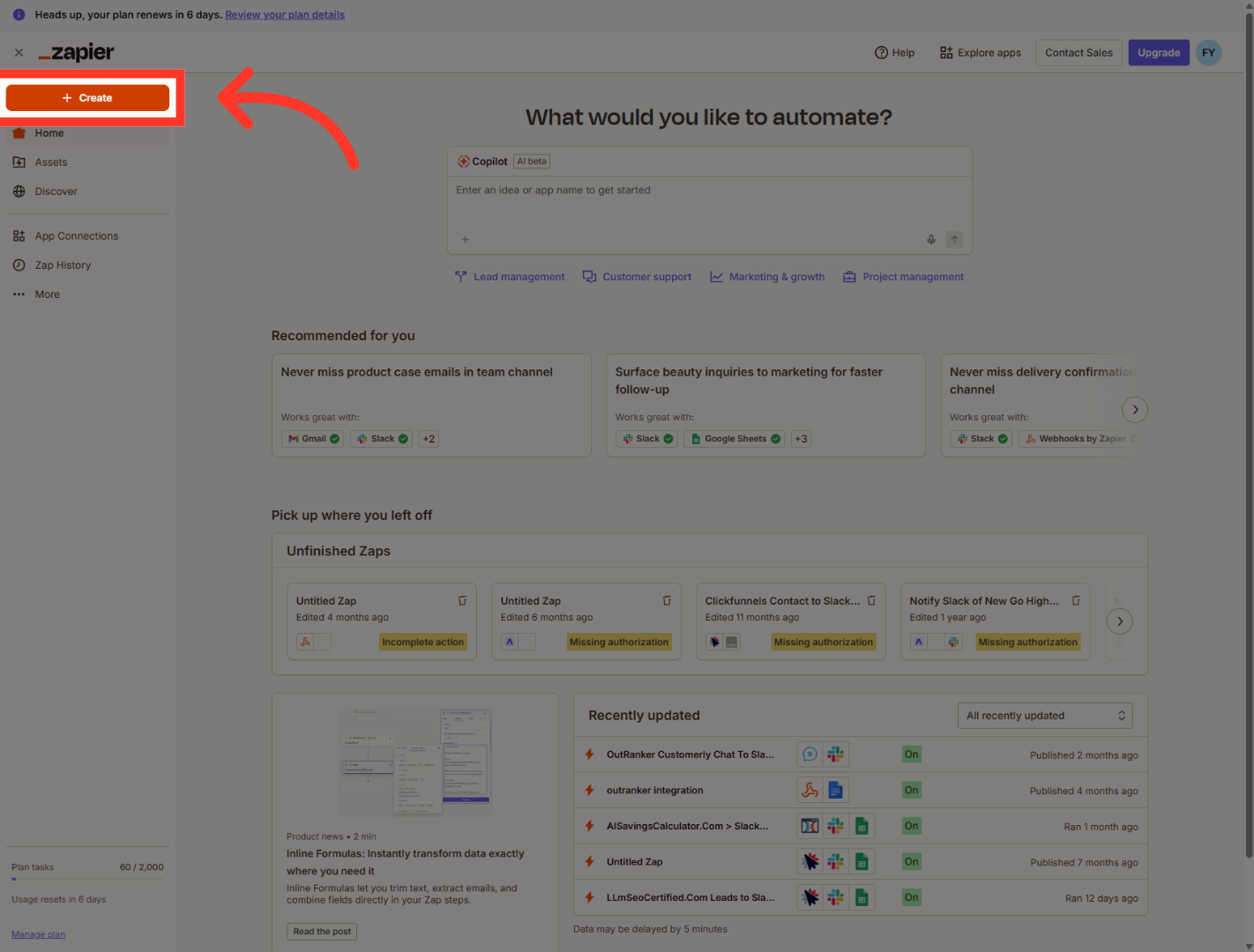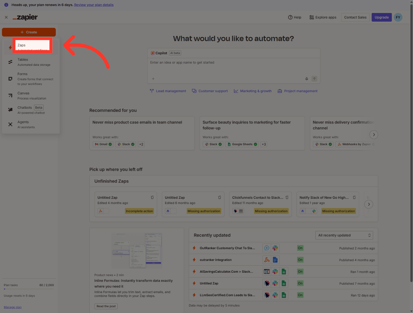 “In Zapier, click Create. Then open Zaps to start building a new workflow.”