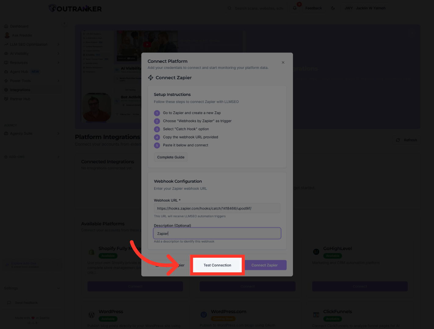 “Now click Test Connection. This checks whether Outranker can reach the Zapier webhook correctly.”