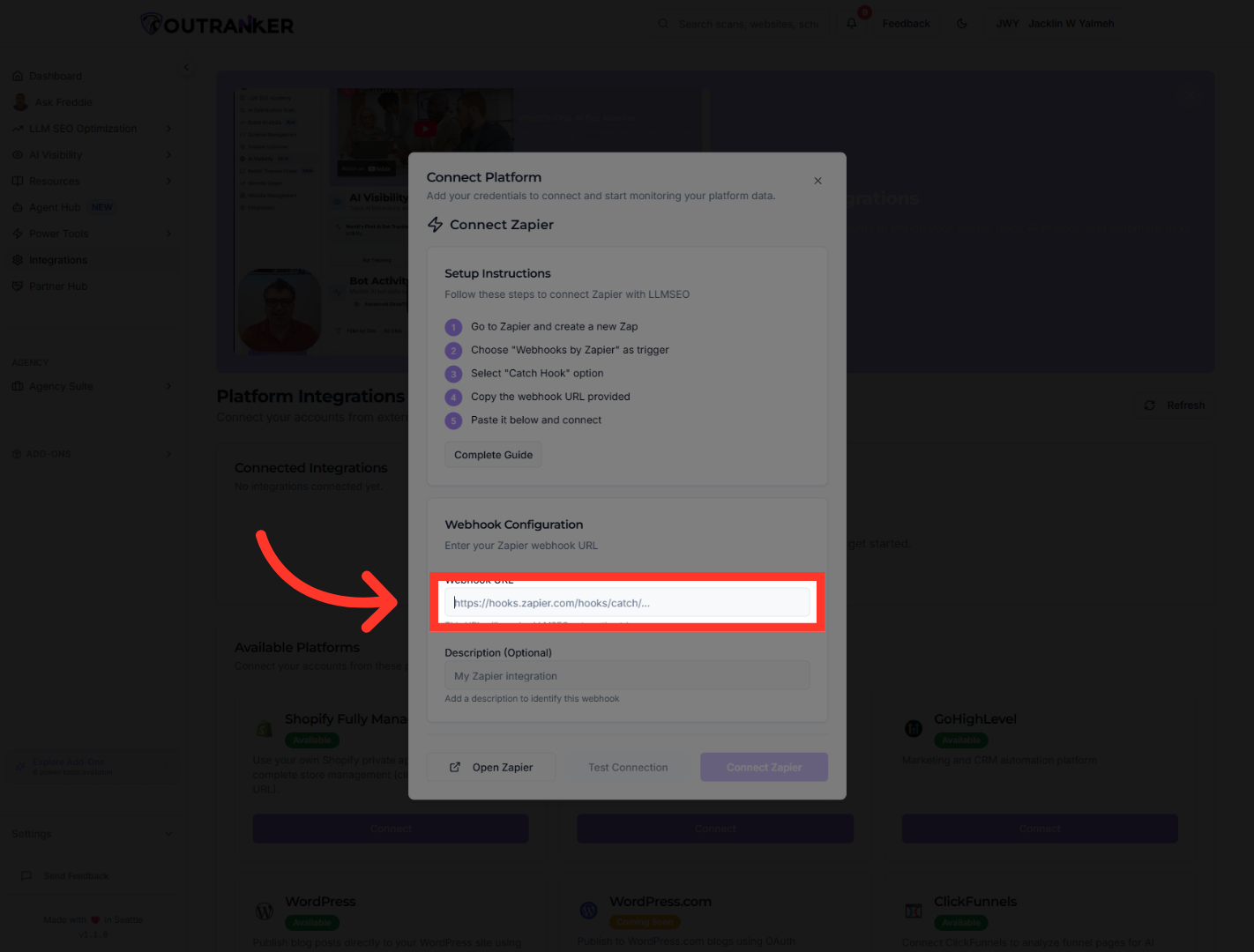 “Go back to Outranker. Your Zapier connection window should still be open.” “In Outranker, click the Webhook URL field. This is where you’ll add the Zapier webhook link.” “Now paste the webhook URL you copied from Zapier. This connects Outranker to the Zap you just created.”