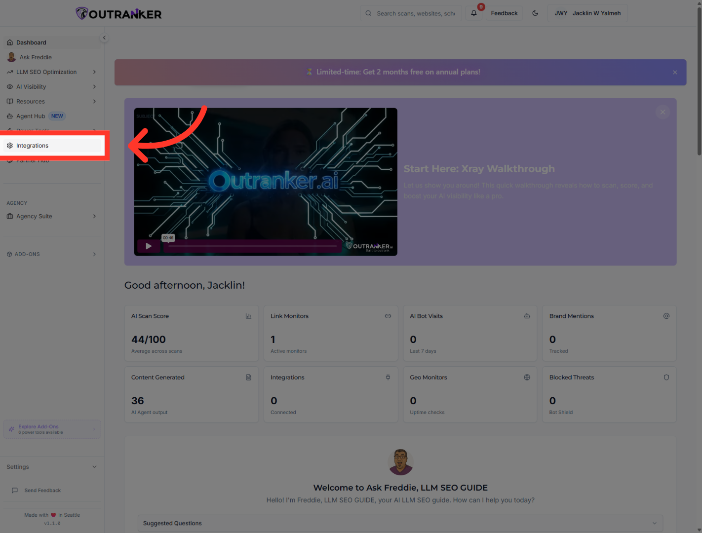 “Start inside Outranker. In the left menu, click Integrations. This is where you connect Outranker with other platforms.”