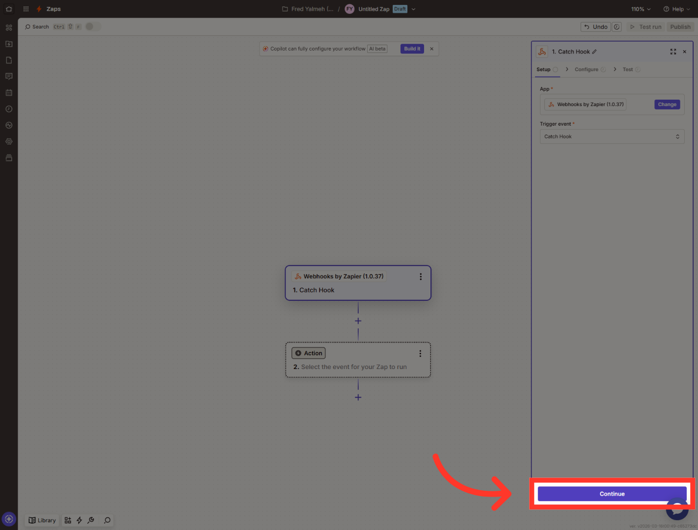 “After selecting Catch Hook, click Continue. This moves you to the webhook setup.”