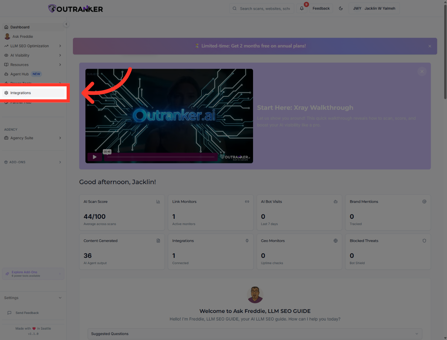 "Start by logging into Outranker and opening the Integrations section from the left-hand menu.