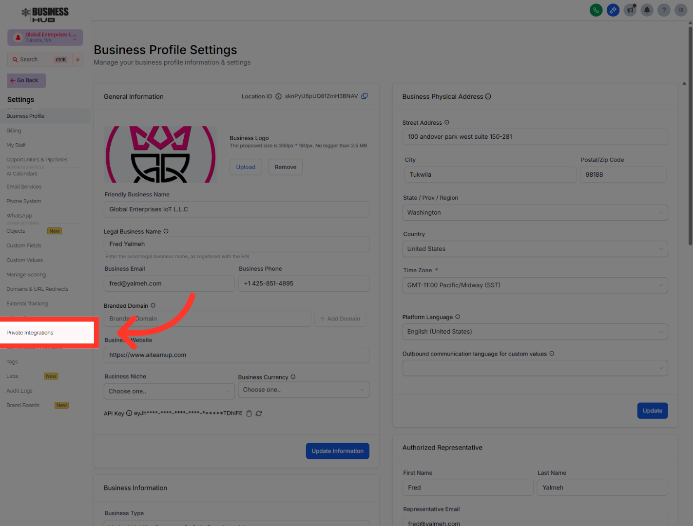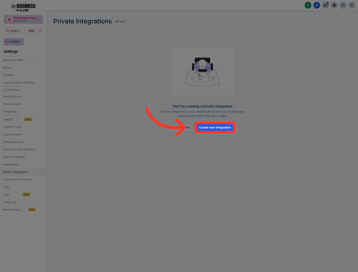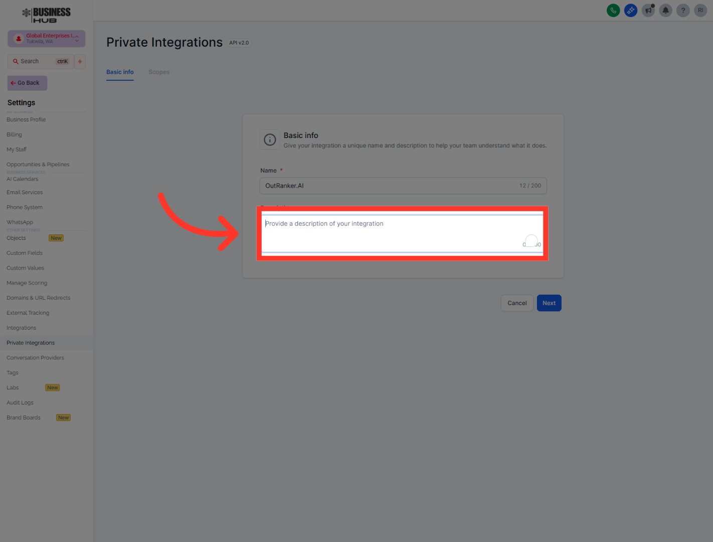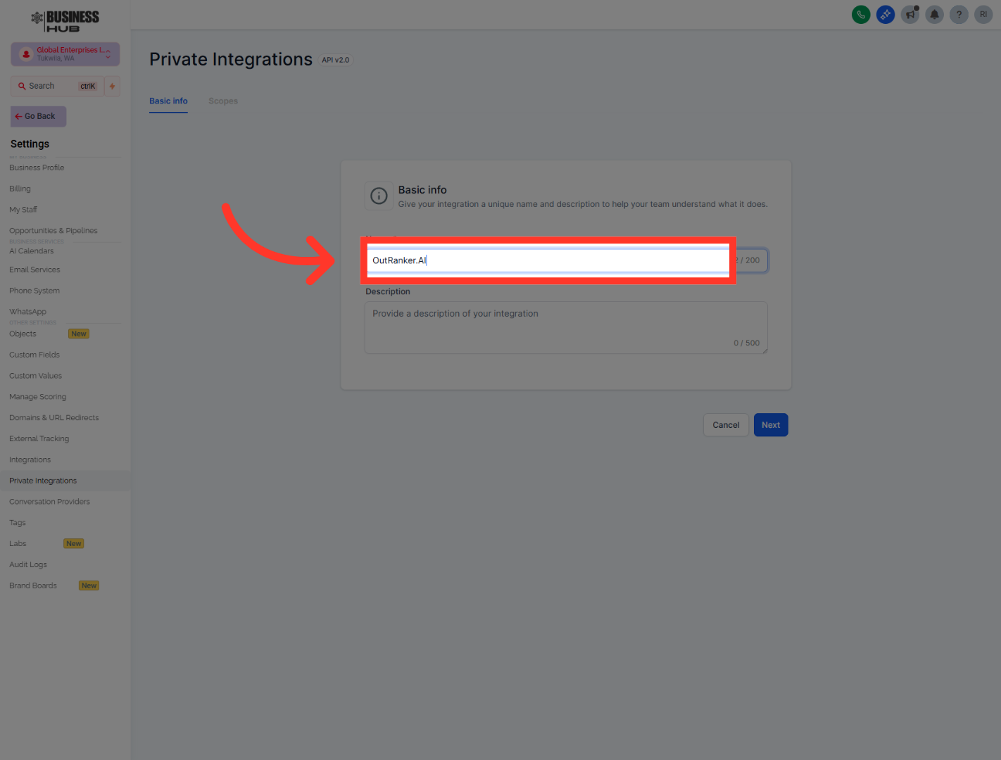 "After that, head back into Business Hub and open Private Integrations. Create a new integration, give it a clear name such as OutRanker.AI, and add a short description so it’s easy to recognize later. This private integration creates the secure connection Outranker will use to work with your GoHighLevel data."