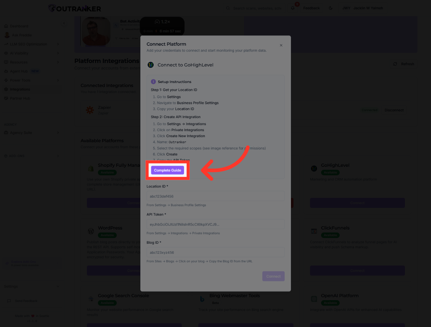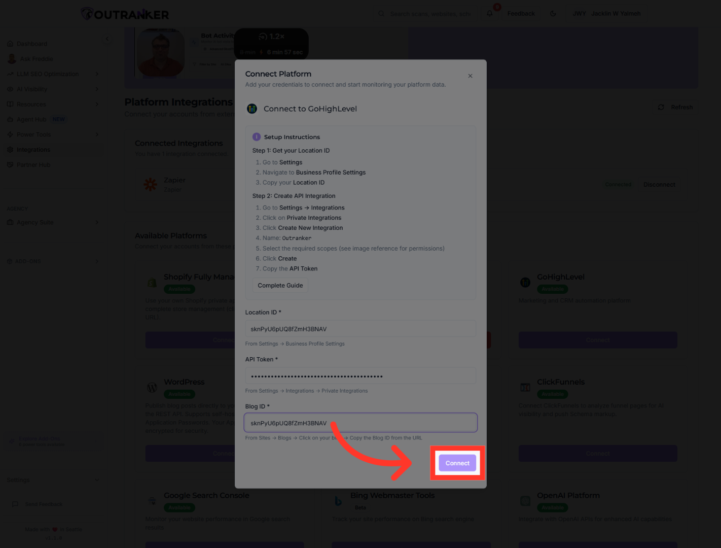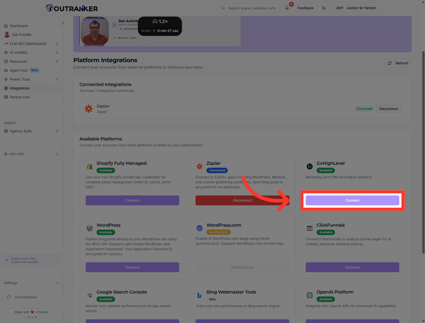 This tutorial guides you through connecting and configuring integrations within the Outranker platform.