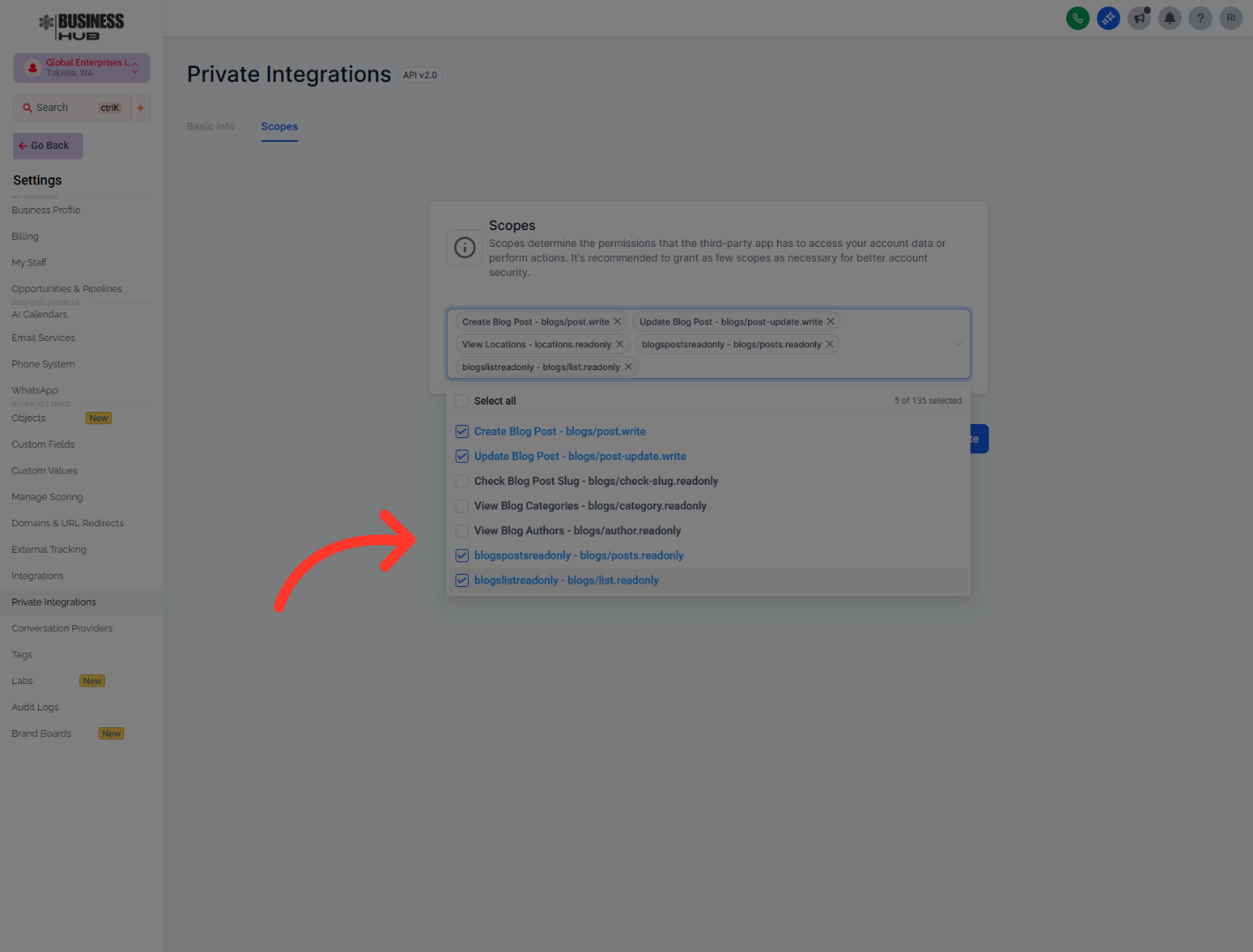 "As part of the setup, you’ll be asked to choose permissions, also called scopes. Select the permissions needed for blog publishing and location access, including the ability to create and update blog posts, and to view locations. Keeping the permissions focused helps the integration work properly without giving broader access than necessary."