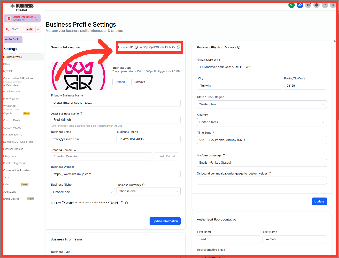 "Once you’re inside the correct Business Hub profile, locate the Location ID in the business profile settings. Then go back to Outranker and paste that value into the Location ID field. This is what tells Outranker exactly which business location it should connect to."