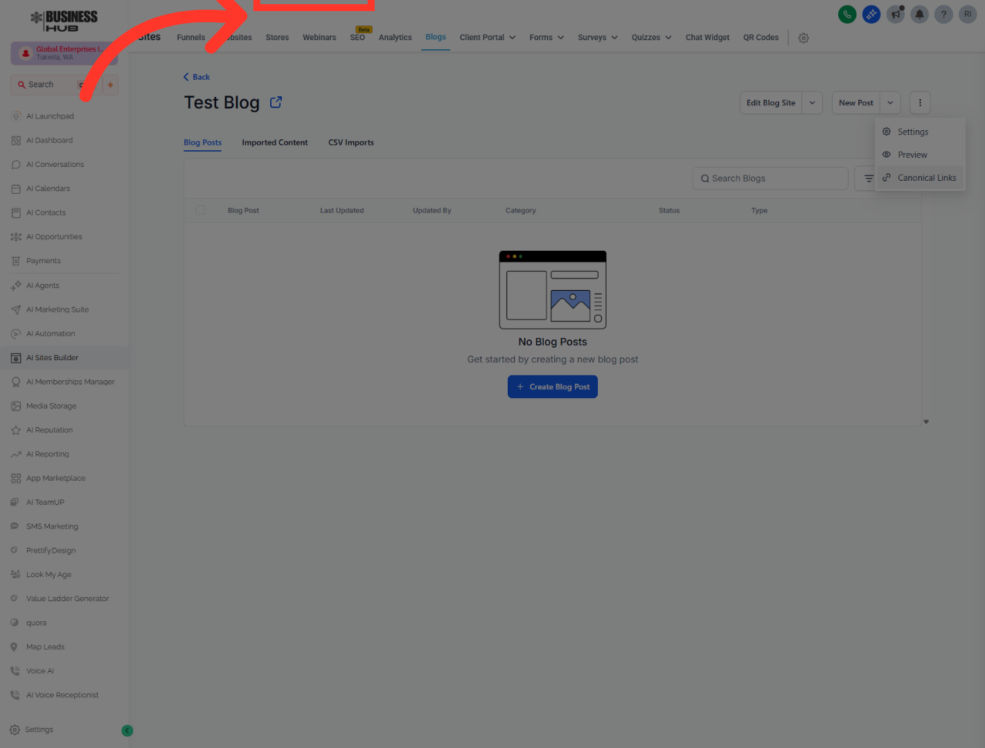 6. Open Business Hub Settings