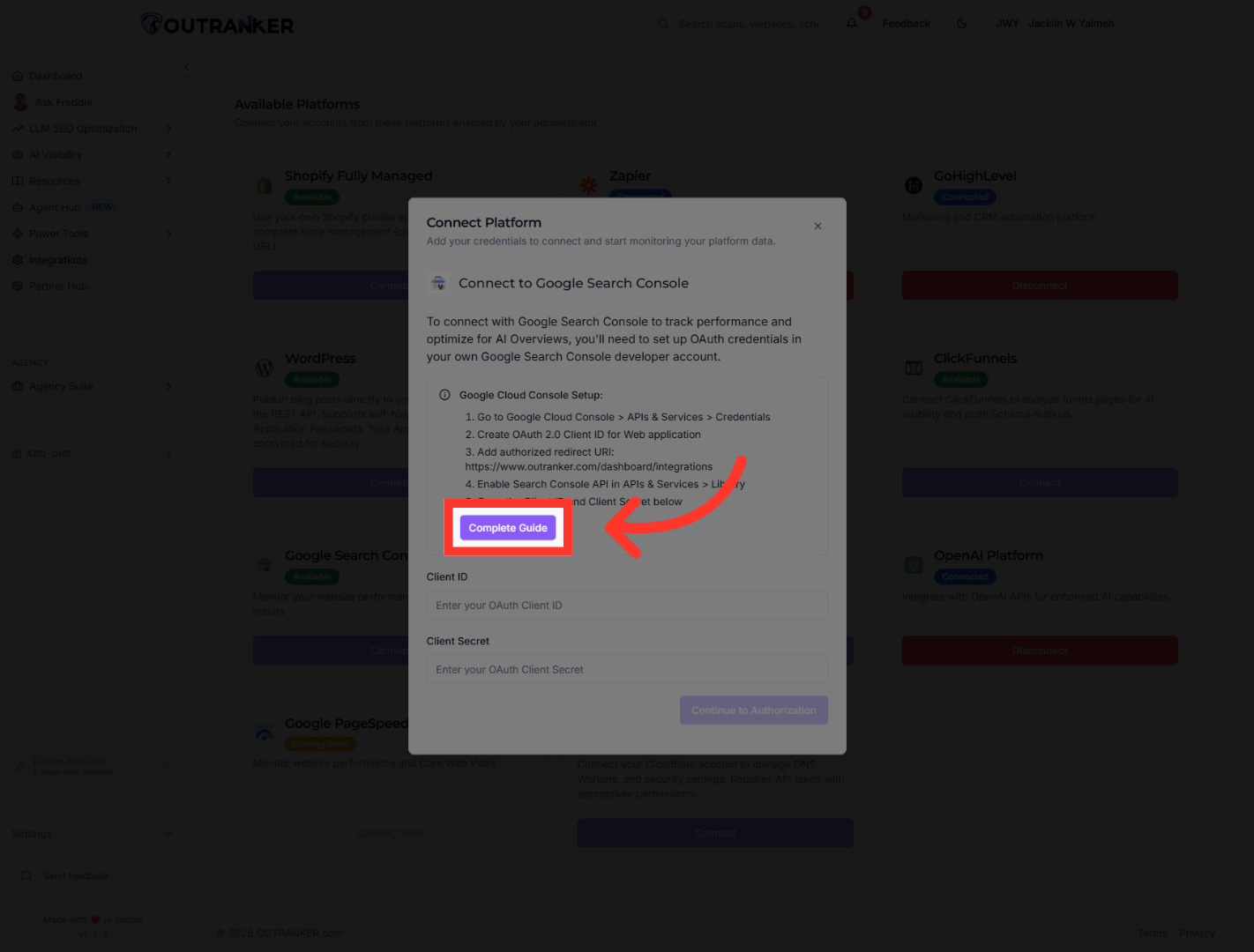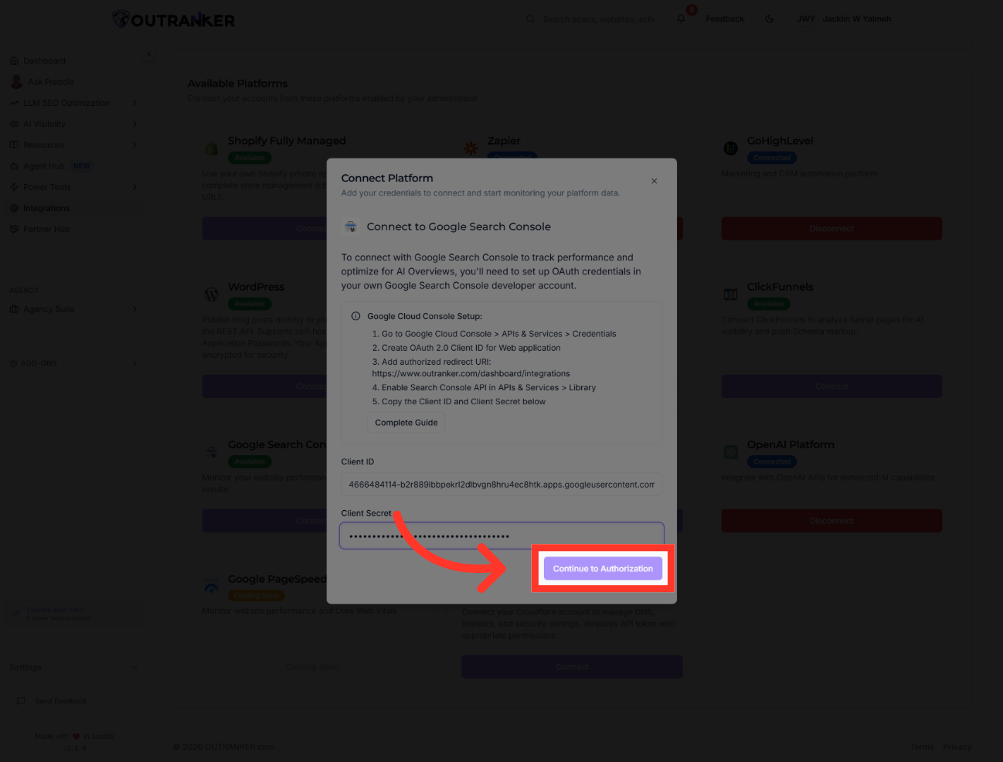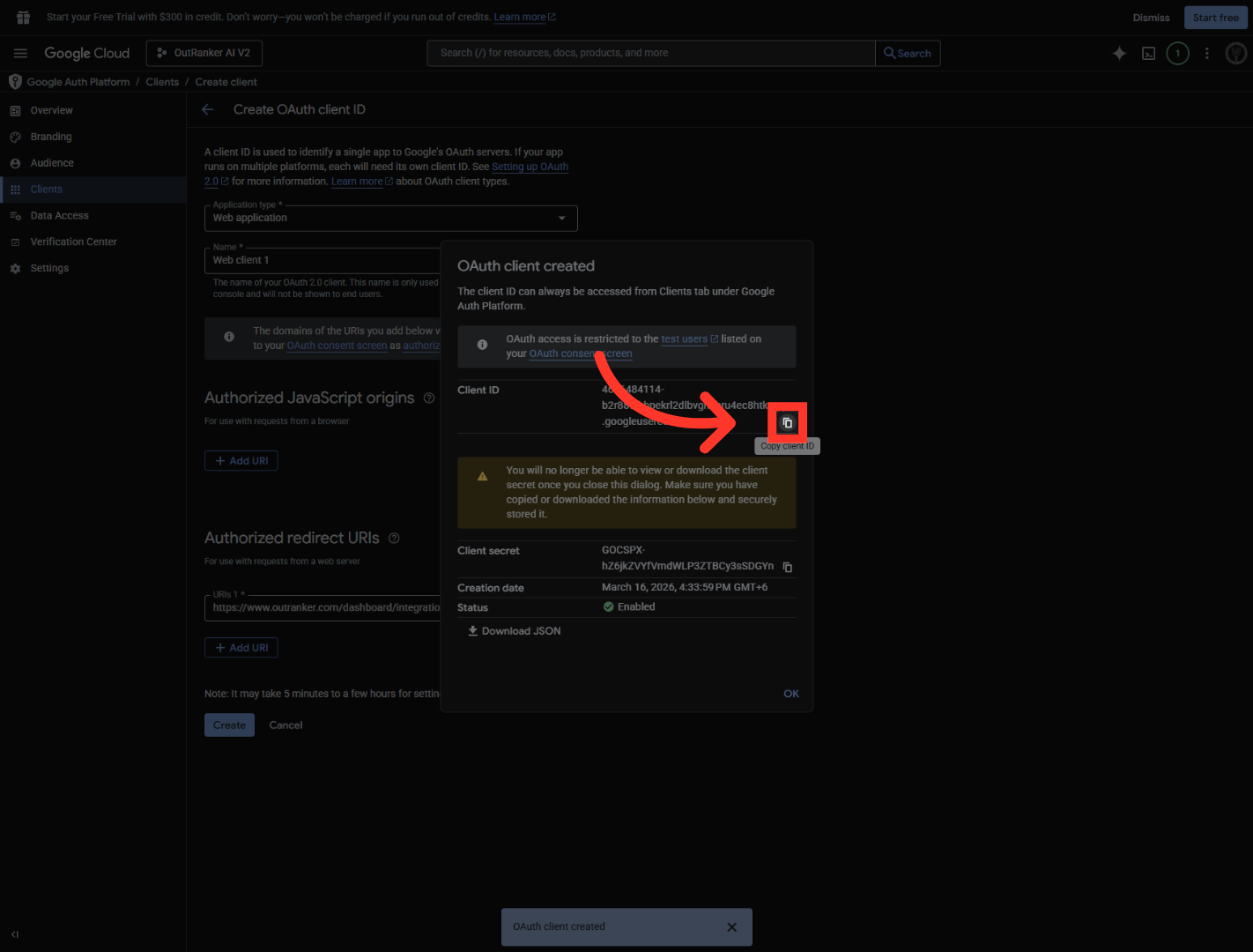 “Once the OAuth client is created, open the credentials and copy the Client ID.” “Return to Outranker and place it in the appropriate field.” “Then go back to Google Cloud, copy the Client Secret, and paste that into Outranker as well.” “These two values are what connect the Google Cloud project to your Outranker integration.”