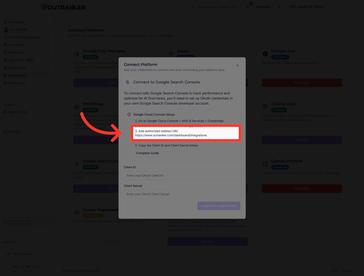 “Next, return to Outranker and copy the authorized redirect URI shown in the integration instructions.” “Then go back to Google Cloud and use that exact redirect URI in your OAuth setup.” “This step is critical, because the redirect URI is what allows Google to send users back to Outranker after authentication.”