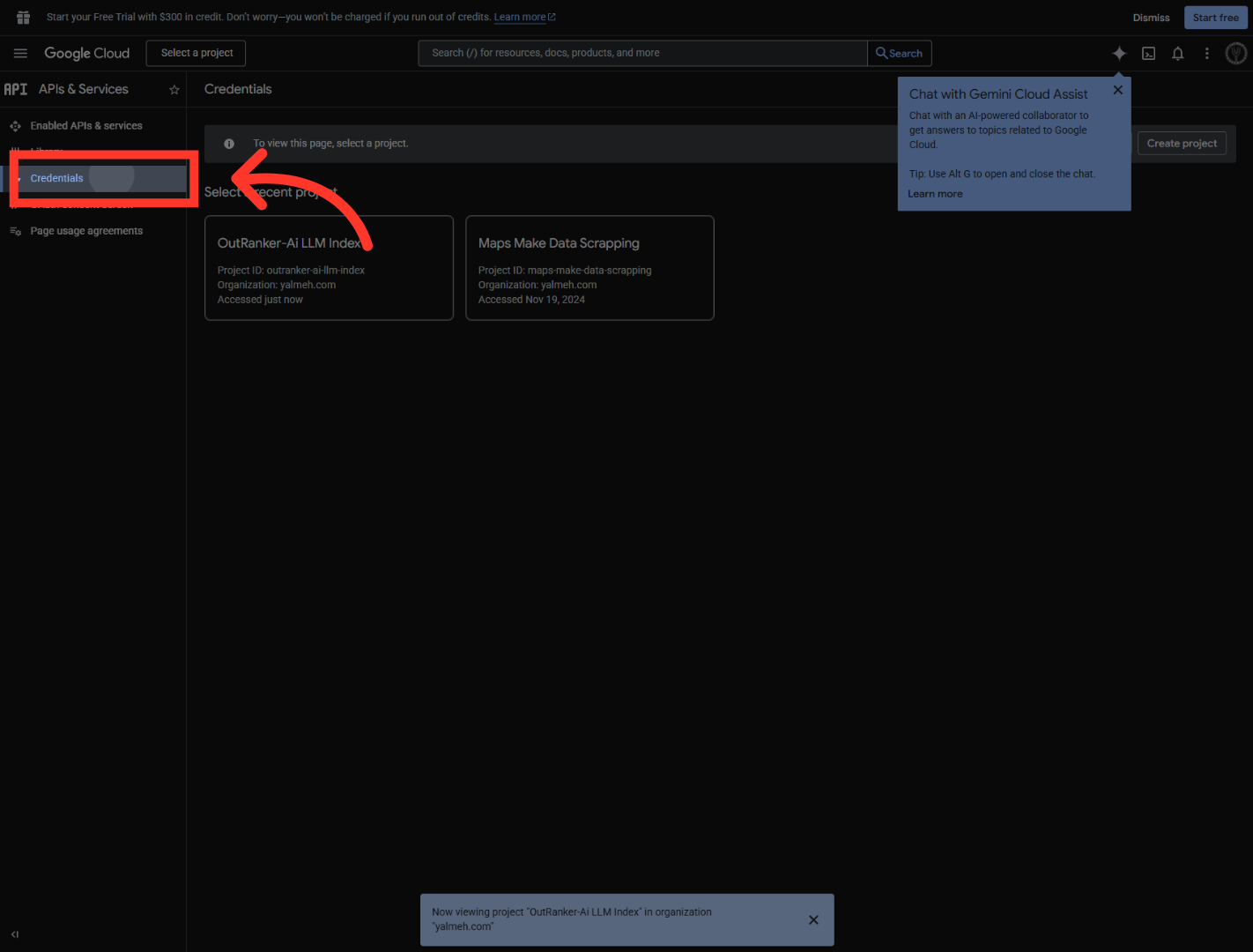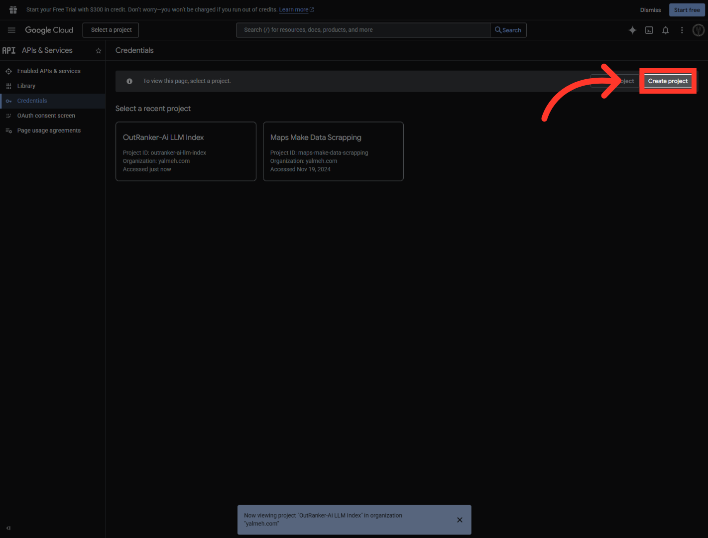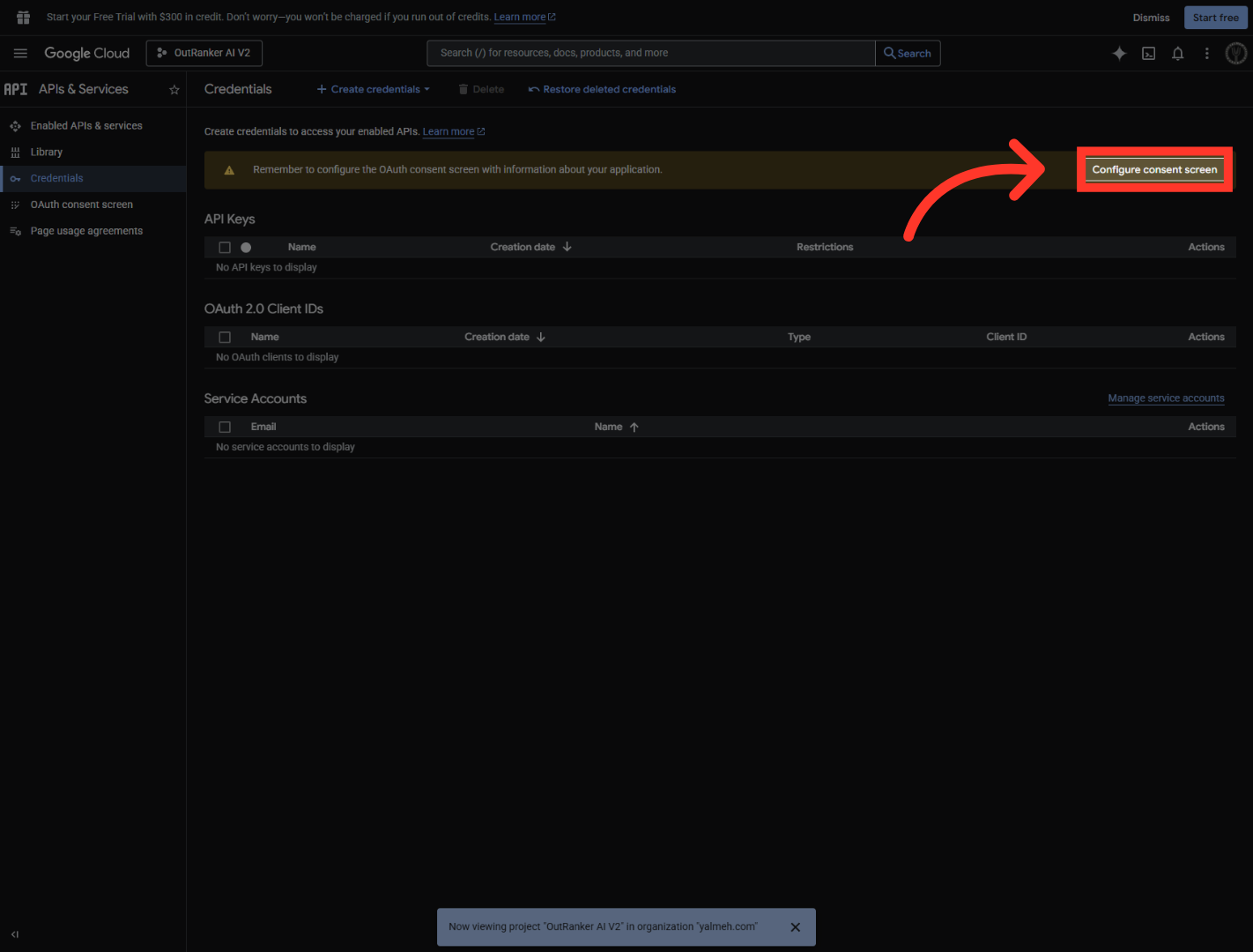 “Next, open Google Cloud Console and go to the Credentials area.” “This is where you’ll manage the project, the OAuth consent screen, and the client credentials required by Outranker.” “You can also use the direct credentials link provided inside Outranker to make the process easier.”