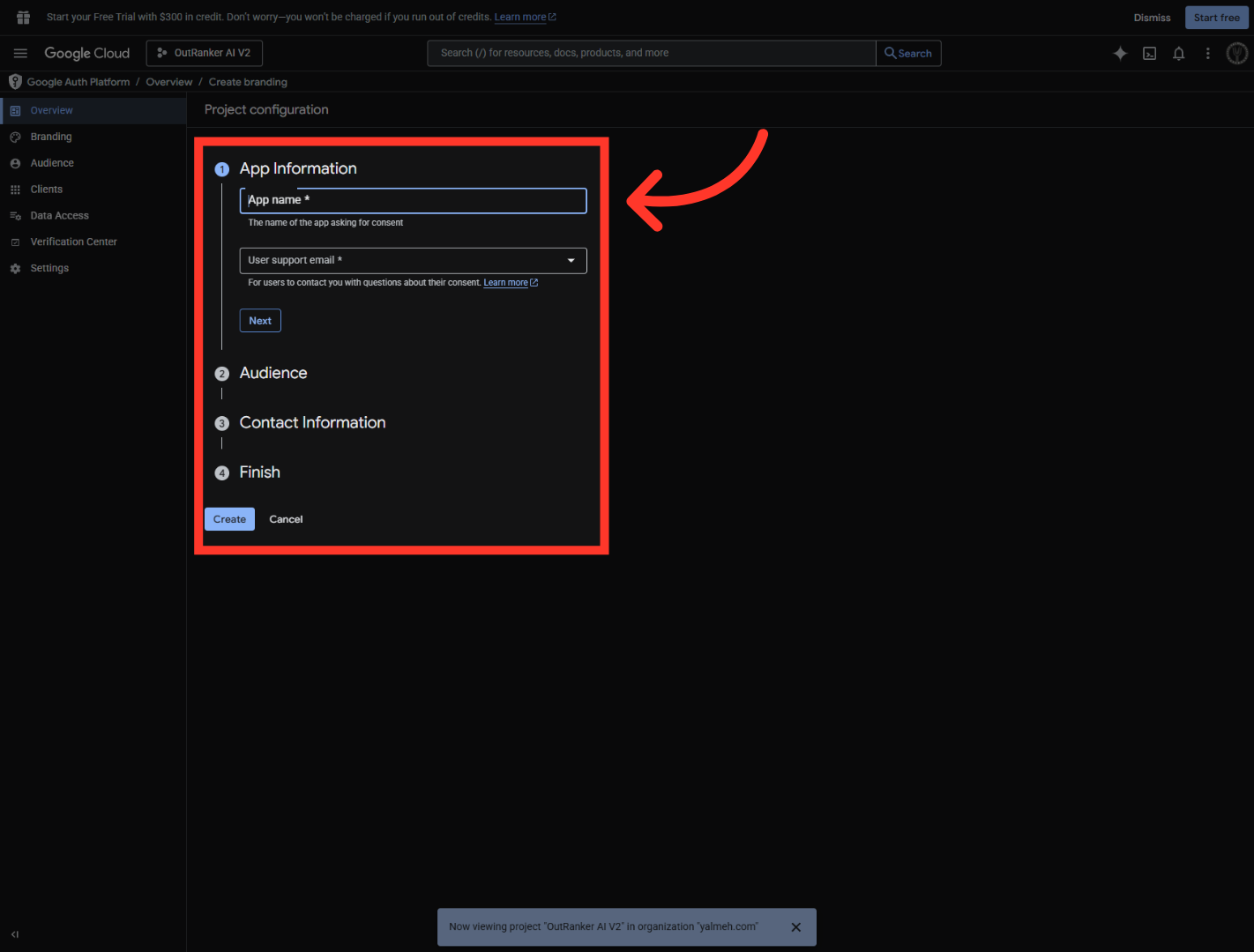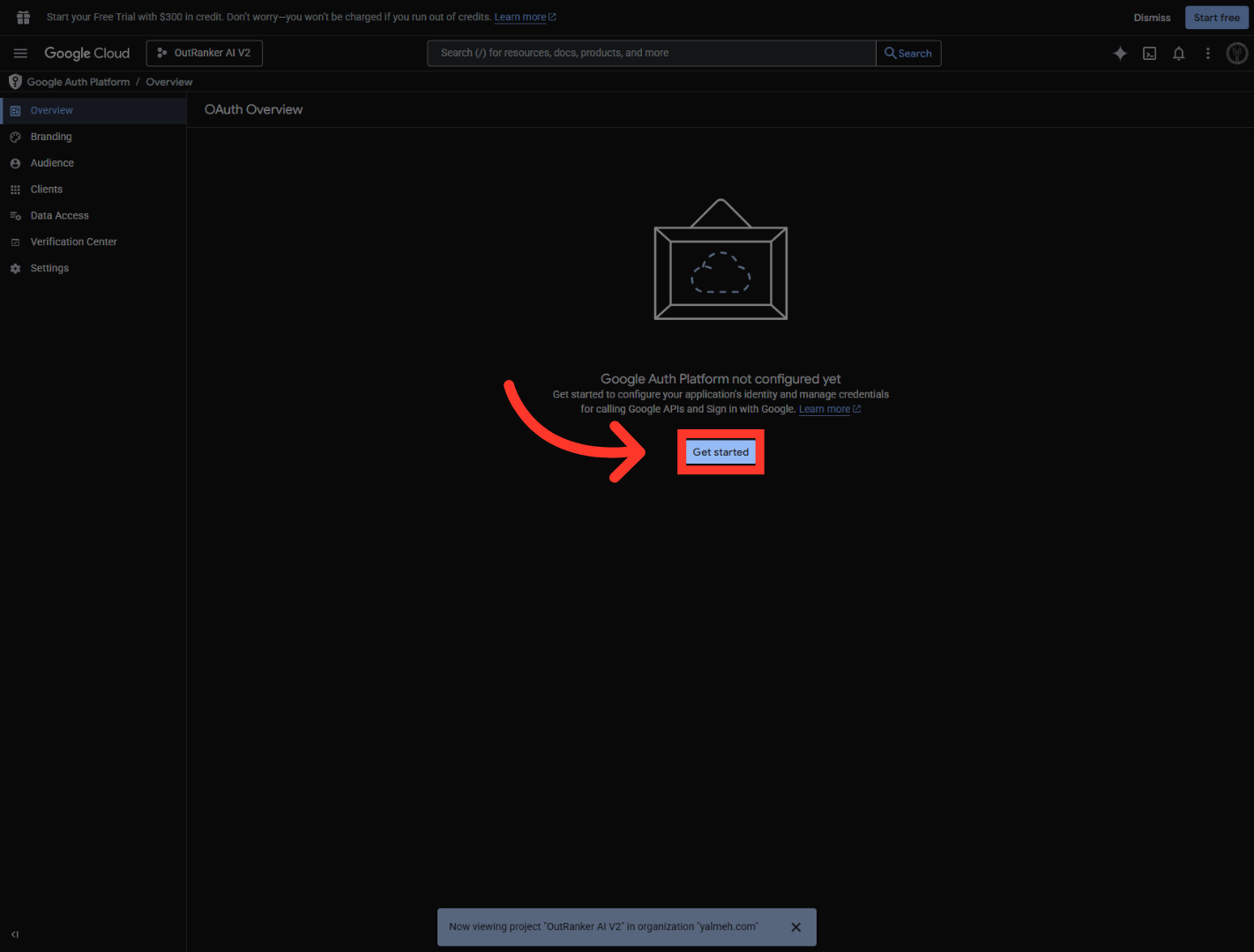 “Once the project is ready, begin configuring the OAuth consent screen.” “Click Configure consent screen, then choose Get started.” “Set the app name to Outranker.ai so users clearly understand what they’re connecting to.” “Then select the appropriate support email address for the integration.” “This consent screen defines how Google presents your app during authorization.”