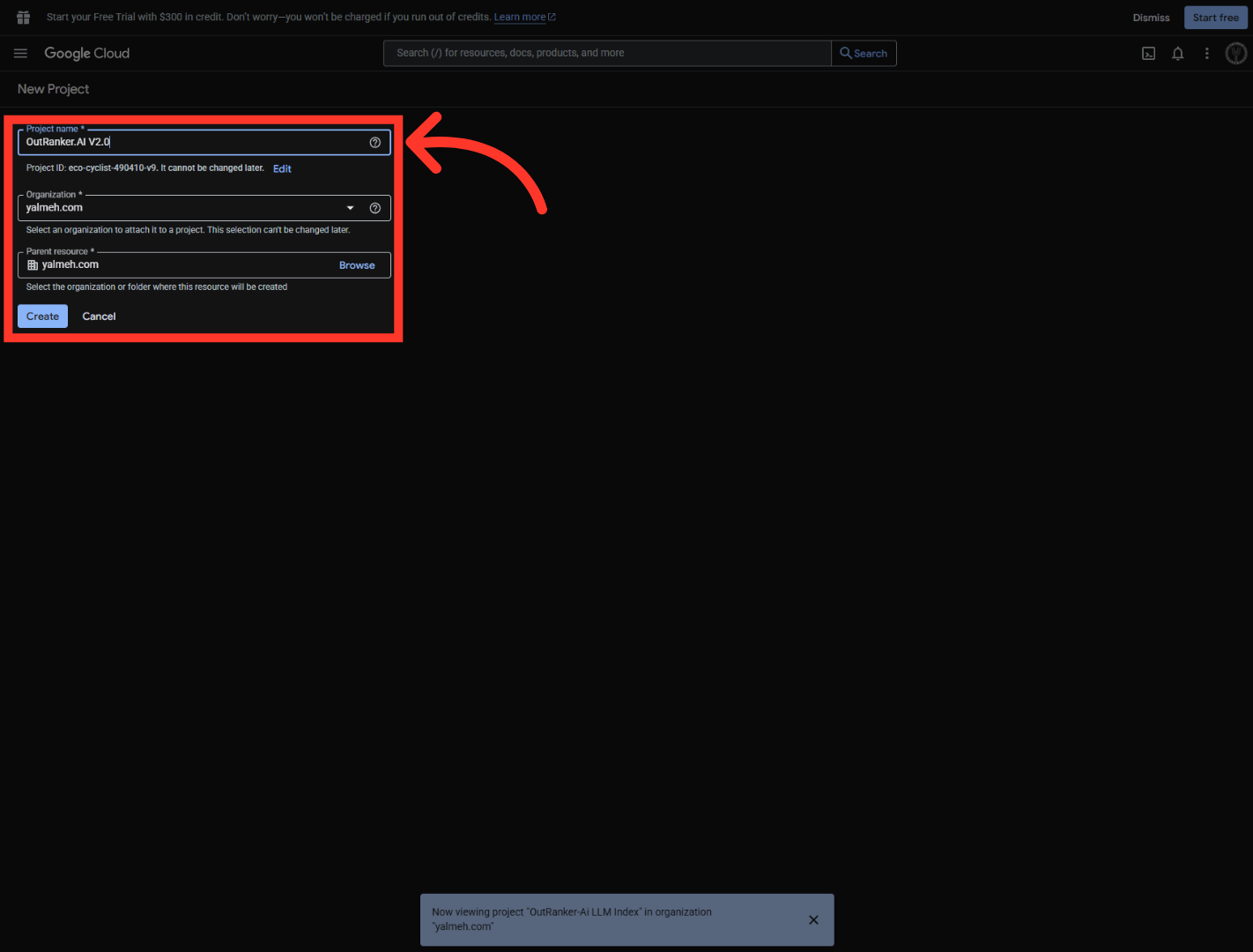 “If you don’t already have the right project set up, create a new Google Cloud project for this integration.” “Give it a clear project name related to Outranker so it’s easy to identify later.” “As you name the project, make sure it follows Google Cloud naming rules.” “Then confirm the correct organization and parent resource before clicking Create.”