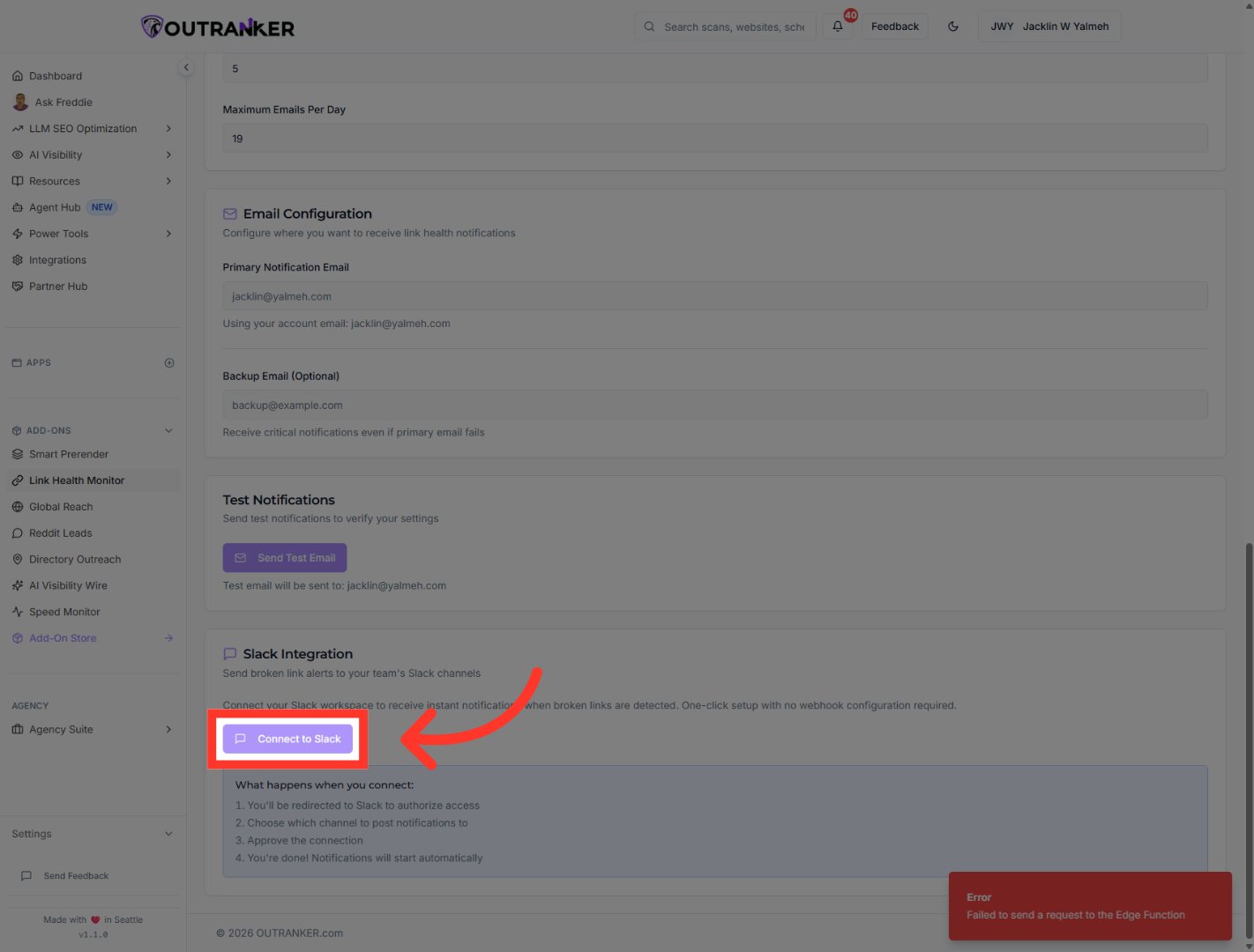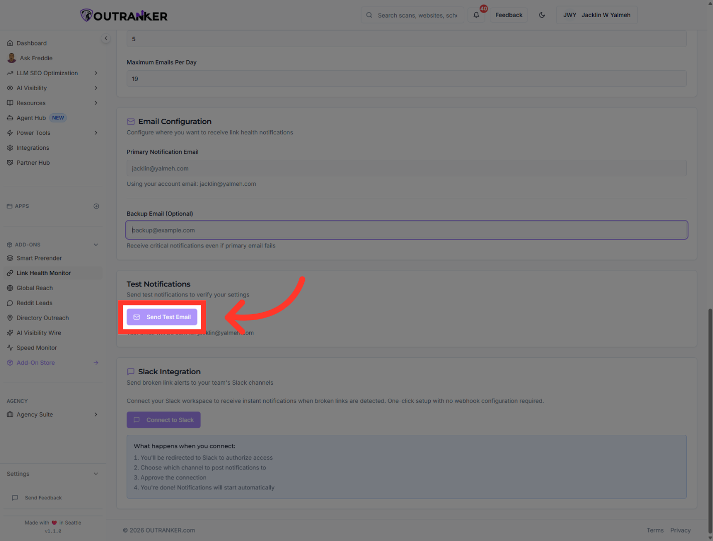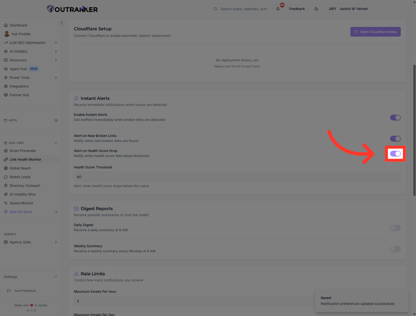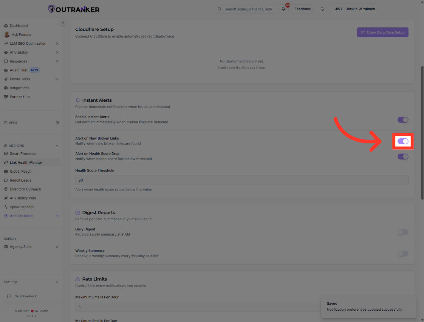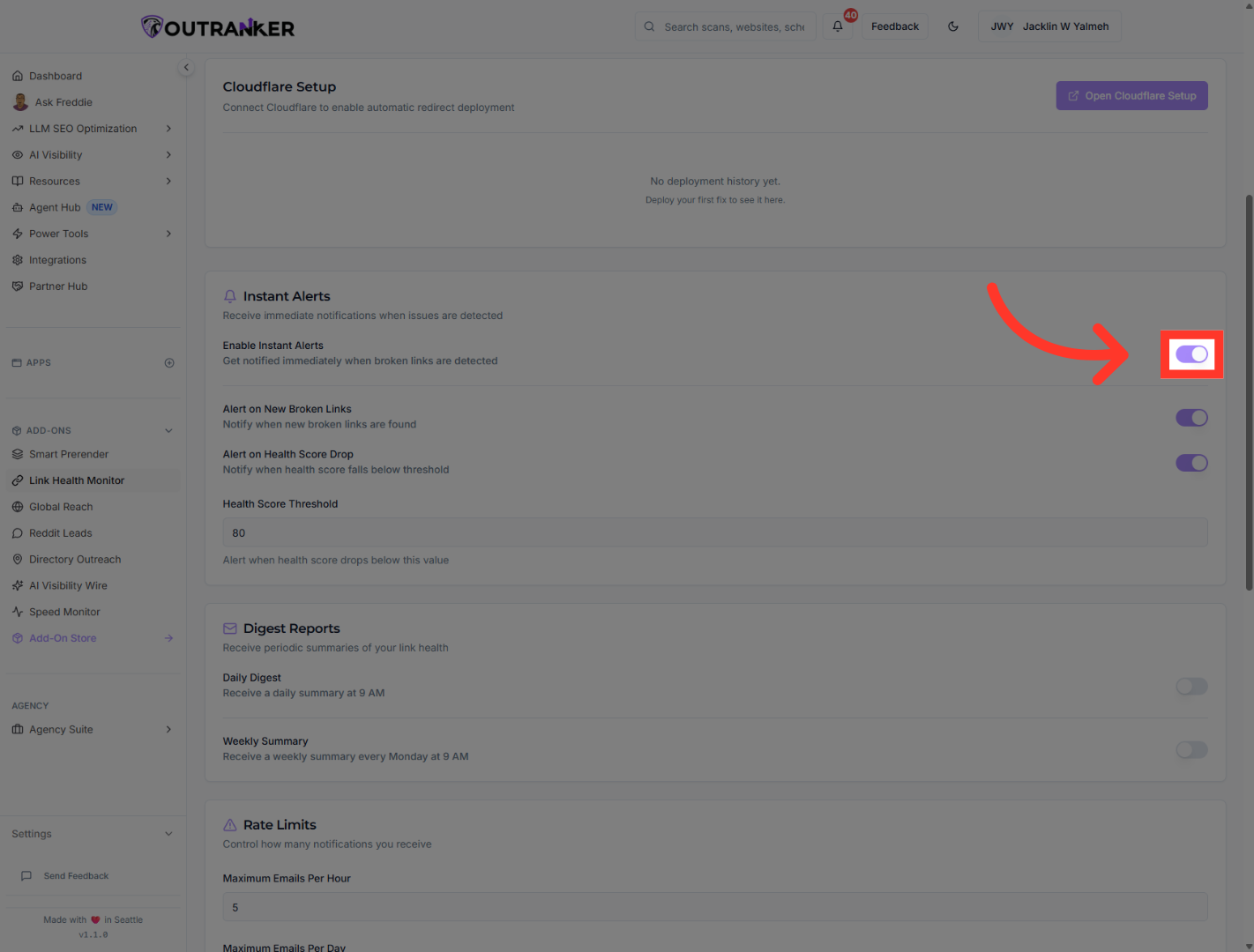 “Find Enable Instant Alerts. Turn it on. This allows Outranker to notify you as soon as broken links are detected.”