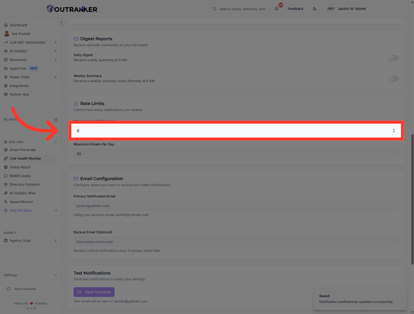“Scroll to the Rate Limits section. Click Maximum Emails Per Hour. Enter the number of alert emails you want to allow each hour. In this example, the value is set to 5.”