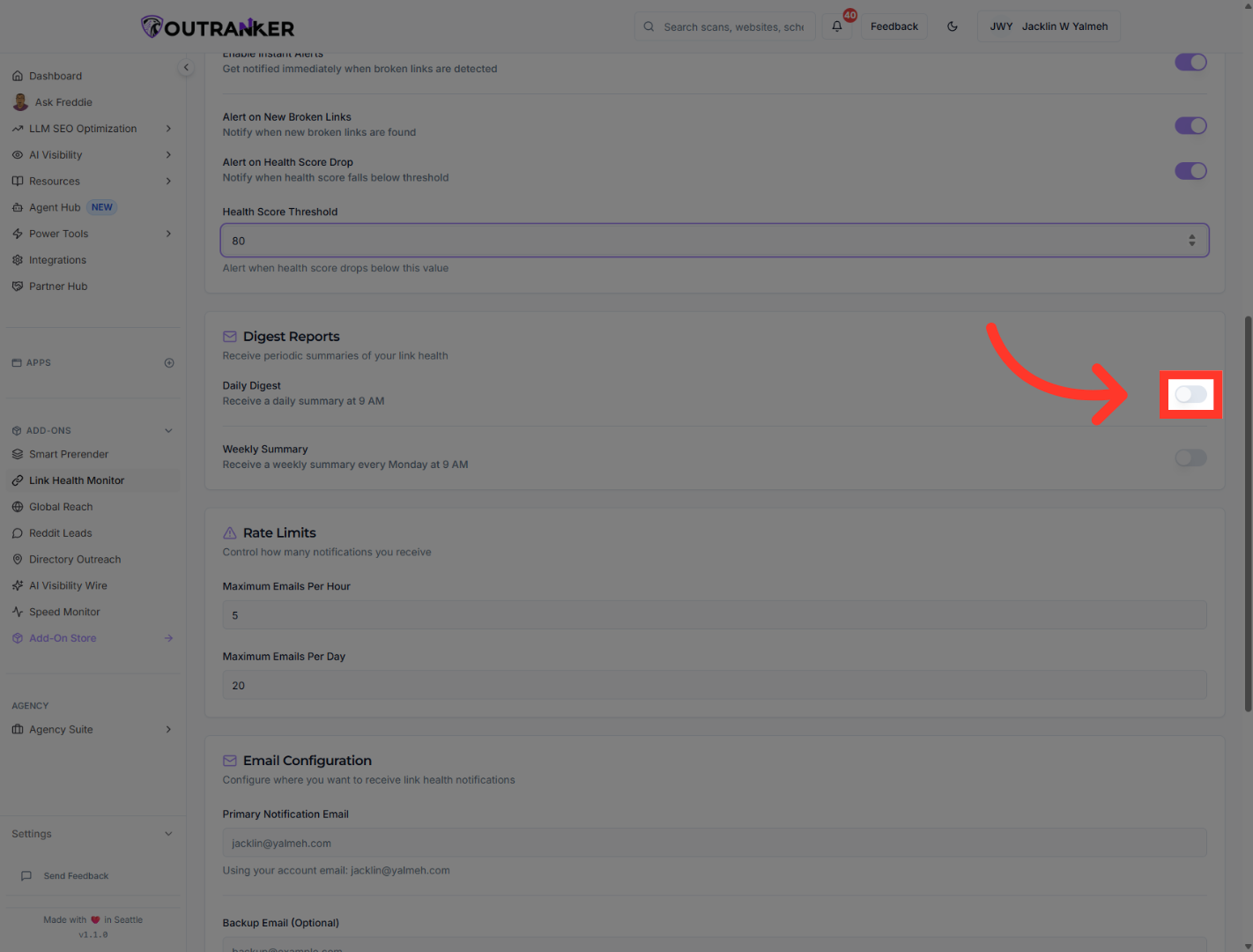“Next, find Daily Digest. Turn it on. This sends a daily summary of your link health status. In this workflow, the summary is set for 9 AM.”