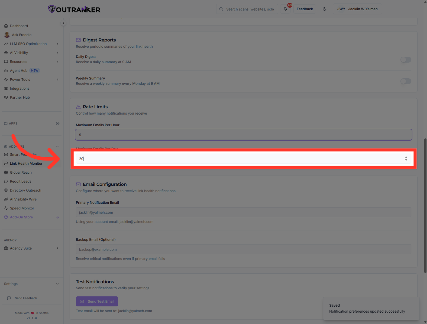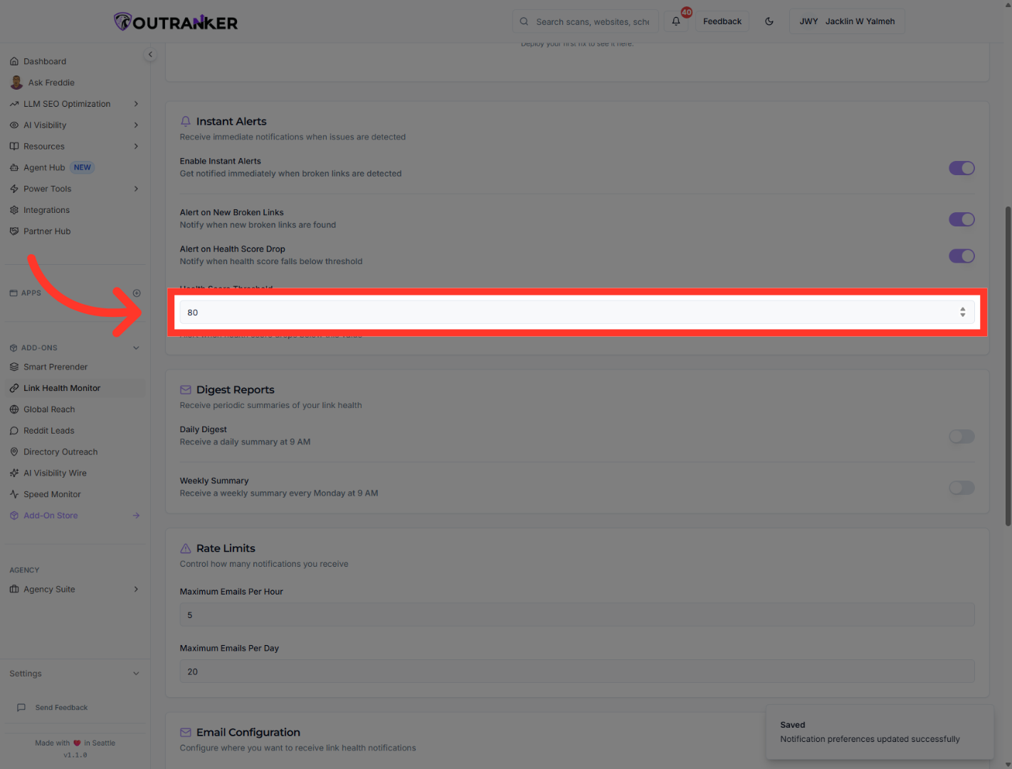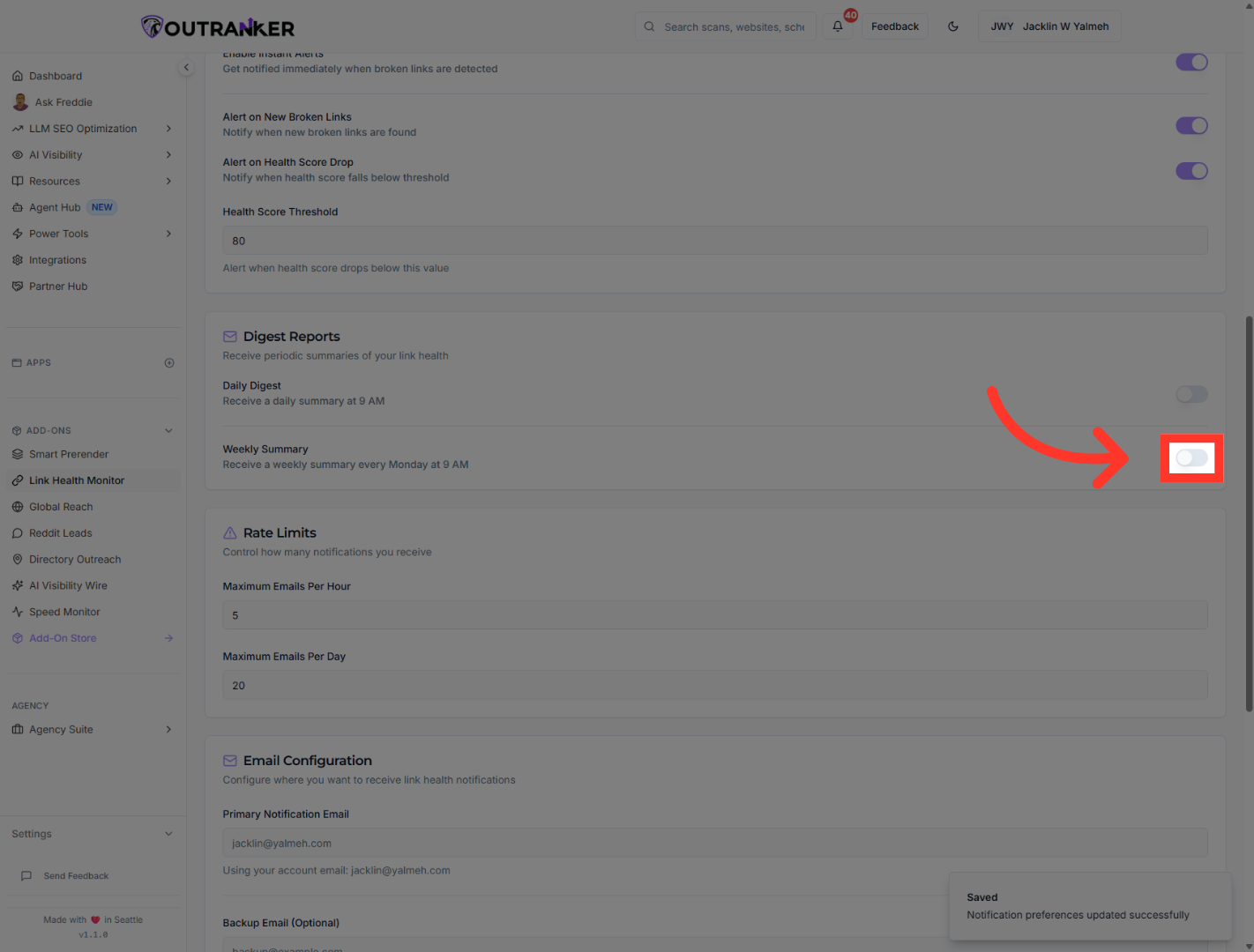 “You’ve now configured link health alerts in Outranker, turned on instant notifications, added daily and weekly summaries, set alert limits, and chosen where alerts should be sent. From here, you can fine-tune your thresholds and notification settings based on how closely you want to monitor your links.”